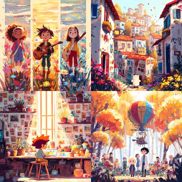Этот стиль отличается яркими цветовыми палитрами и причудливым шармом. Его характеризует игривое повествование и глубина сюжета. Текстурная насыщенность и многослойные композиции создают увлекательные визуальные образы, напоминающие иллюстрации к детским книгам и произведения народного искусства.