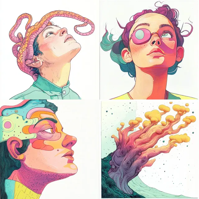 Причудливый неосюрреализм завораживает своей яркой пастельной палитрой и плавными линиями, создавая динамичное взаимодействие между человеческими фигурами и органическими формами. Замысловатые детали и гармоничные композиции вызывают ощущение игривой фантазии, а сюрреалистичная атмосфера объединяет современную иллюстрацию с неосюрреализмом. Этот стиль отлично подходит для творческих задач, но может не хватать точности, необходимой для фотореалистичных или технических приложений.