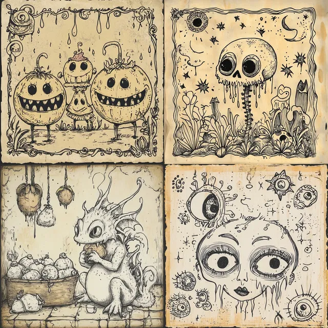 Стиль «Whimsical Gothic Sketch» отличается набросочным, рукописным характером с акцентом на рисунки чернилами, каракули и винтажную эстетику. Часто изображаются антропоморфные существа, фантазийные ландшафты и сюрреалистичная архитектура, что создаёт игривую, но мрачно-юмористическую атмосферу. Дизайн отличается причудливостью и сюрреализмом, черпая вдохновение в эстетике, напоминающей Тима Бёртона, а также в готике и викторианском стиле. Монохромная палитра и оттенки сепии усиливают ностальгическое ощущение, а стиль отлично подходит для создания детализированных, фактурных композиций. Однако ему может не хватать фотореализма в ситуациях, где требуется высокая точность. Идеален для фэнтези-иллюстраций, графических романов и необычного брендинга.