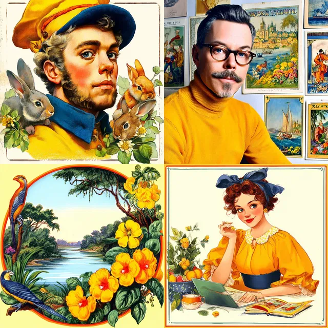 Яркая цветовая палитра и чёткие контуры определяют этот стиль, сочетая эстетику ретро с причудливыми элементами. Игривые мотивы и ностальгические темы создают жизнерадостные композиции, напоминающие иллюстрации середины XX века и винтажные плакаты.