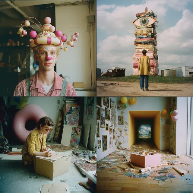 Сюрреализм сочетается с причудливостью в стиле, который восхищает своими игровыми композициями и сказочными визуалами. Пастельные оттенки и мягкие градиенты создают нежную, располагающую атмосферу, а замысловатые детали и многослойные текстуры добавляют глубины и сложности.