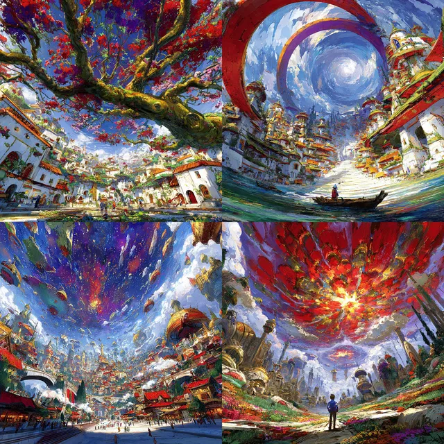 Использование насыщенных цветов усиливает сюрреалистичную и сказочную атмосферу, а текстурированные поверхности и многослойные детали добавляют глубину и богатство.