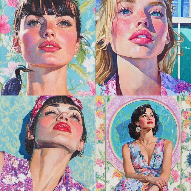 Стиль «Whimsical Pastel Realism» очаровывает своим ярким реализмом и игривым воображением, сочетая очарование ретро с современными элементами. В этом стиле прекрасно удаются сложные цветочные мотивы и ботанические элементы, которые часто изображаются на футуристическом или ностальгическом фоне. Для создания динамичных композиций, привлекающих внимание и производящих сильное визуальное впечатление, используется пастельная палитра.
