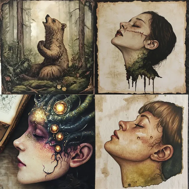 Этот стиль отличается насыщенной текстурой и замысловатыми деталями. Использование тонов сепии и природных цветов вызывает чувство ностальгии и вневременности. Композиции сложны и витиеваты, они вдохновлены эстетикой ар-нуво и викторианской эпохи. В работах прослеживается повторяющаяся тема природы и фантазии с акцентом на причудливые и мифические элементы.