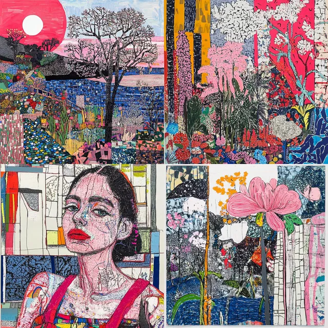 Сложное искусство лоскутного шитья преобладает, сплетая яркие цвета и сложные текстуры в единое визуальное полотно. Стиль процветает за счёт наслаивания и коллажей, создавая динамичное взаимодействие геометрических мотивов и абстрактных форм.