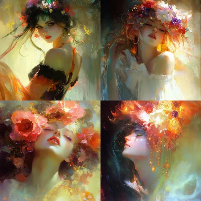 Этот яркий и воздушный стиль завораживает своими живописными мазками и насыщенной цветовой палитрой. Благодаря богатым текстурам и плавающим композициям создаётся сказочная атмосфера, напоминающая об искусстве ар-нуво и прерафаэлитов. Стиль отлично подходит для изображения фантастических и мифологических сюжетов, предлагая причудливое и чарующее визуальное повествование. Он прекрасно проявляет себя в фэнтези-иллюстрации и концепт-арте, но может быть менее точен в техническом или фотореалистичном контексте, предпочитая более свободный и выразительный подход.