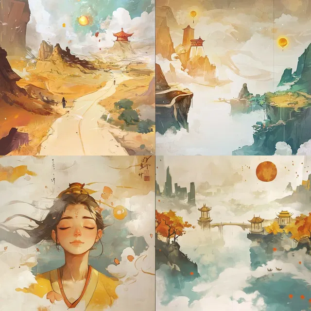 Воздушные акварельные пейзажи завораживают своей тонкой манерой письма и гармоничными композициями. В них сочетаются влияние восточного искусства и импрессионистические техники. Мягкие цветовые палитры и нежное освещение создают сказочную атмосферу, а безмятежные пейзажи и изящные фигуры вызывают ощущение спокойствия и мистики.