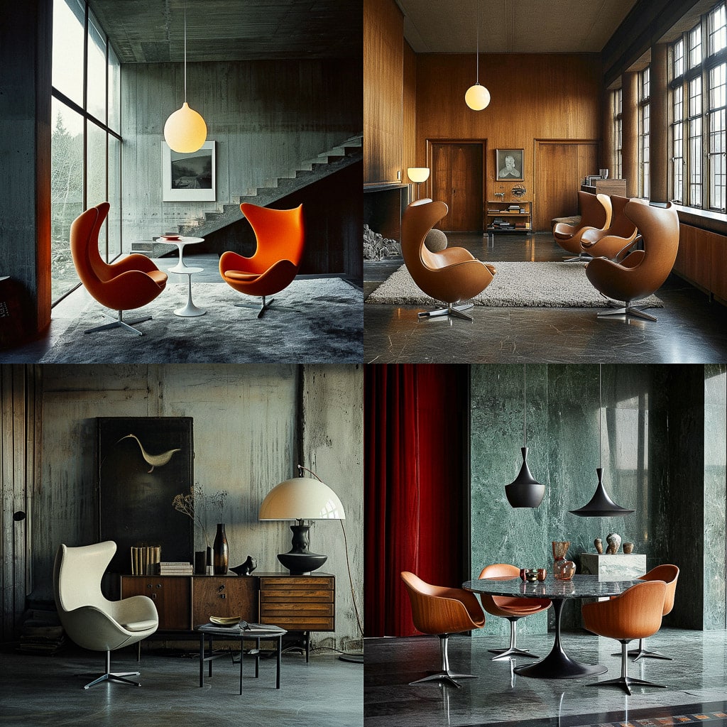 Среди наиболее известных работ Арне Якобсена — мебель для отеля SAS Royal в Копенгагене и знаменитые стулья серии Egg Chair и Swan Chair. Его архитектурные проекты, такие как Центр культуры и науки в Орхусе, также стали символами датского модернизма.