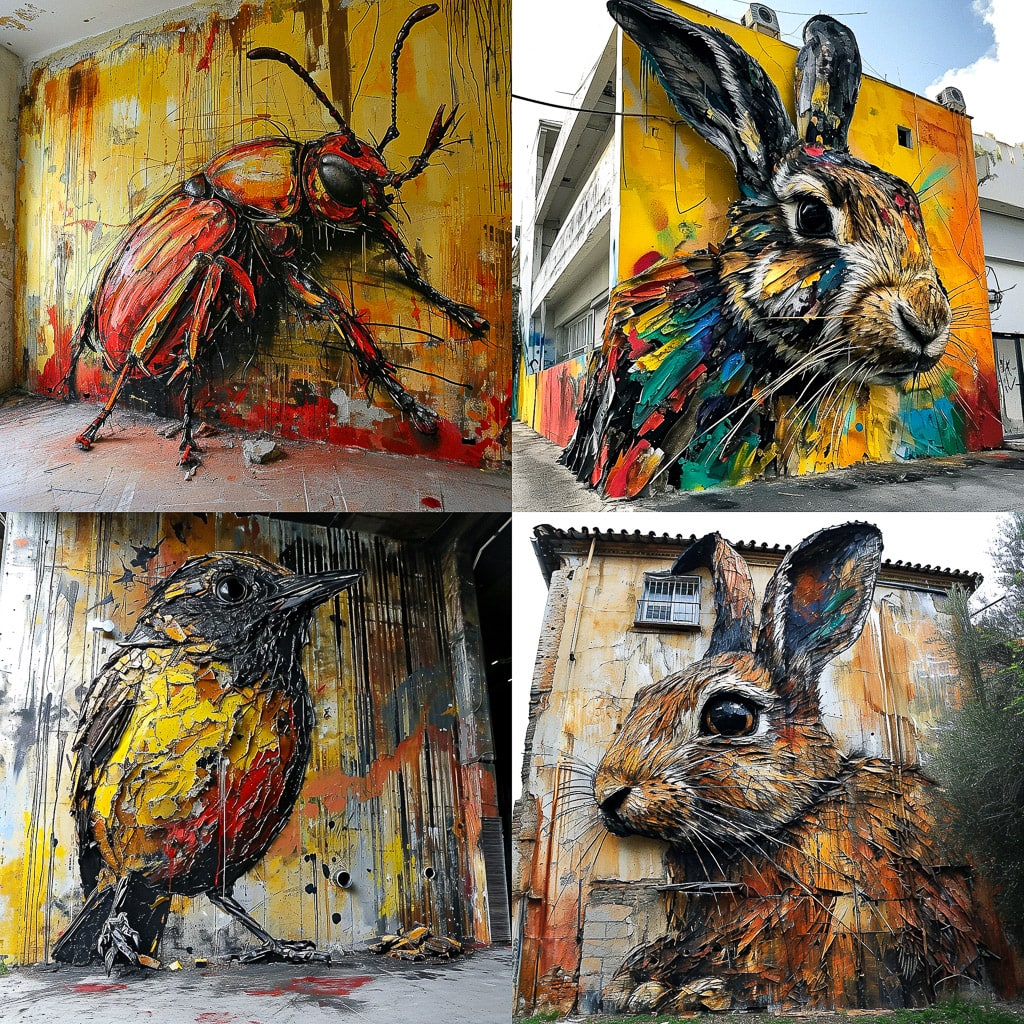 Художник использует разнообразные техники, включая живопись и коллажи. Он создаёт работы, которые вызывают эмоции и заставляют задуматься. В его произведениях можно увидеть отражение современной культуры и общества, а также личные переживания и впечатления.