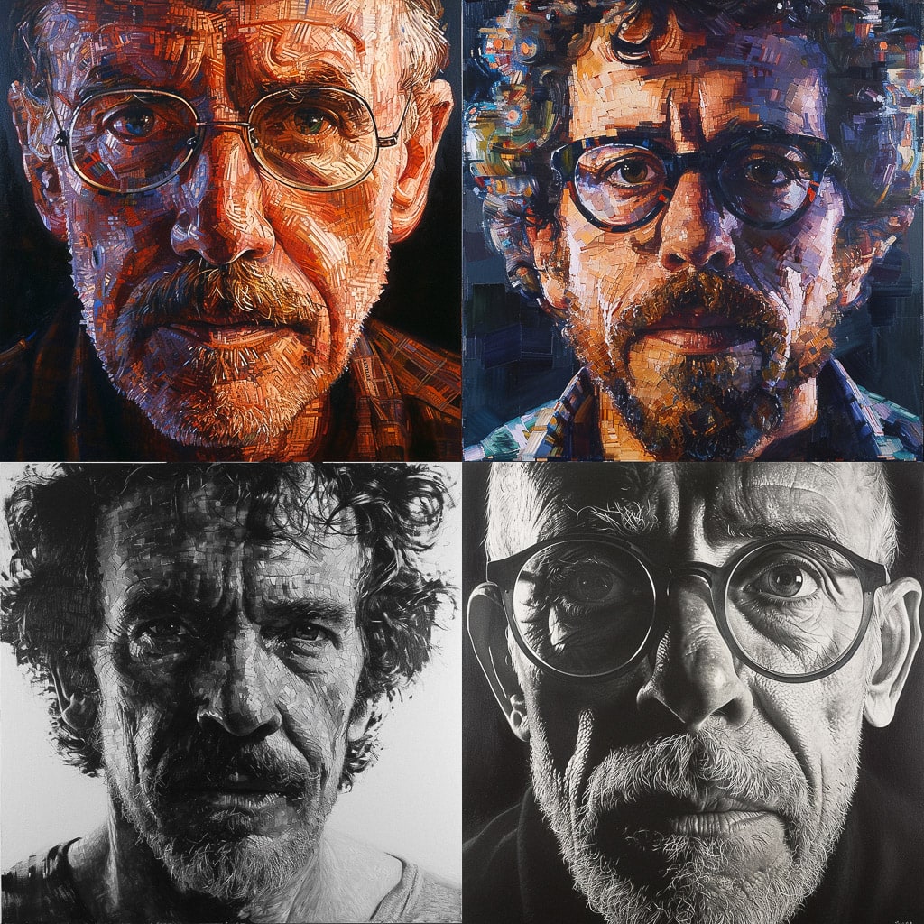 Чак Клоуз — американский художник, известный своими крупноформатными портретами. Он использует технику живописи, которую сам называет «пиксельной». Клоуз создаёт изображения из маленьких квадратов, напоминающих пиксели. Это позволяет ему достигать невероятной детализации и точности в передаче черт лица.