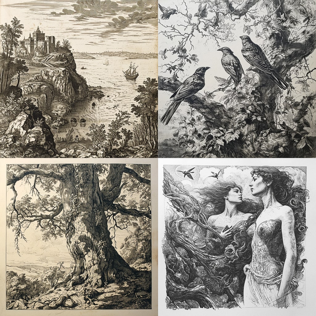 Copperplate engraving — это техника глубокой печати, которая позволяет создавать изображения с высокой детализацией и чёткими линиями. Она зародилась в Европе в XVI веке и стала популярной благодаря своей способности воспроизводить сложные графические элементы.