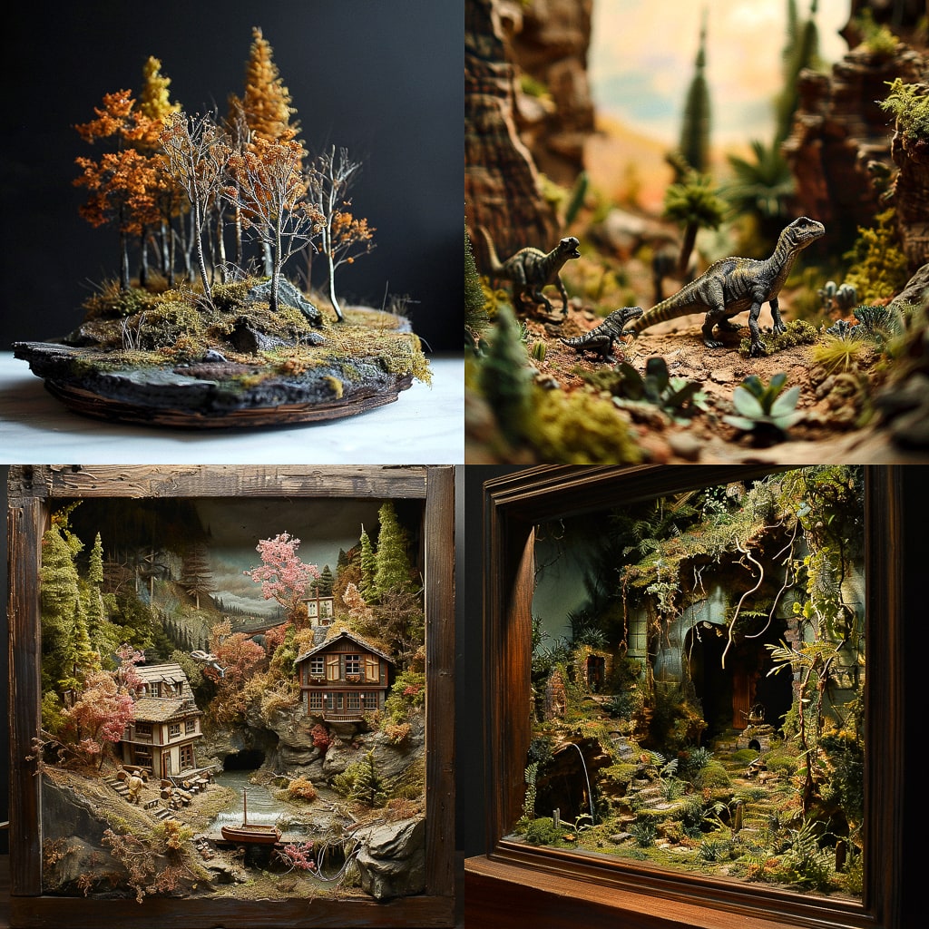 Диорамы могут быть выполнены в различных художественных стилях, от реализма до абстракции. Они требуют от художника не только мастерства в живописи и скульптуре, но и умения работать с пространством и светом.