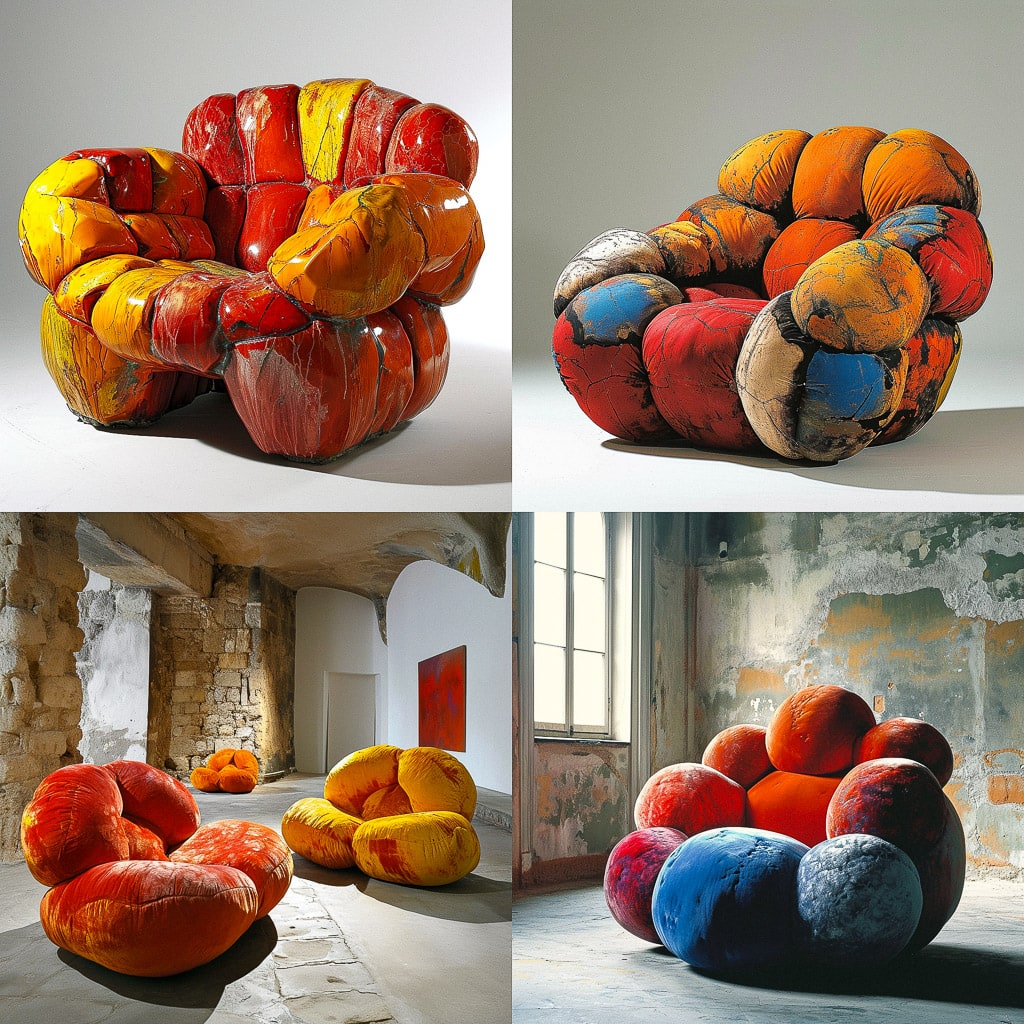 Песке использует инновационные материалы и техники, чтобы создавать уникальные и запоминающиеся объекты. Его мебель отличается яркими цветами, нестандартными формами и смелыми решениями.