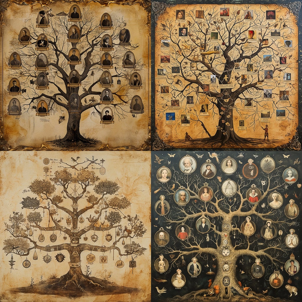 Genealogical tree (генеалогическое древо) — это не только инструмент для изучения истории семьи, но и художественный приём, который может быть использован в различных видах искусства. В живописи и графике генеалогическое древо может стать основой для создания портретной серии, где каждый член семьи представлен в виде художественного образа.