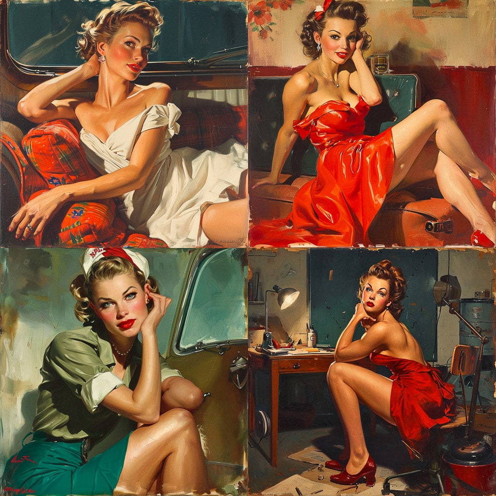 Гил Эльвгрен (1900–1970) — американский художник, известный своими иллюстрациями в стиле пин-ап. Его работы отличаются яркими красками, выразительными фигурами и динамичными композициями. Эльвгрен создавал изображения, которые были одновременно игривыми и провокационными, отражая дух времени и интересы публики.