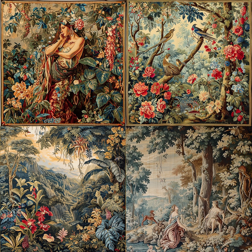 Gobelin tapestry — это искусство создания ковров-картин с богатыми узорами и сюжетами. Техника гобеленового ткачества зародилась во Франции и отличается сложностью исполнения. Мастера вручную создают уникальные композиции из разноцветных нитей, что позволяет добиться высокой детализации и глубины цвета.