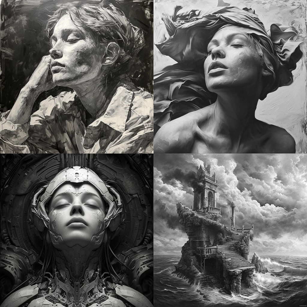 Grayscale может быть применена в различных жанрах и техниках, таких как живопись, графика, фотография и цифровое искусство. Этот стиль позволяет художнику сосредоточиться на форме, текстуре и композиции, не отвлекаясь на цветовые нюансы.
