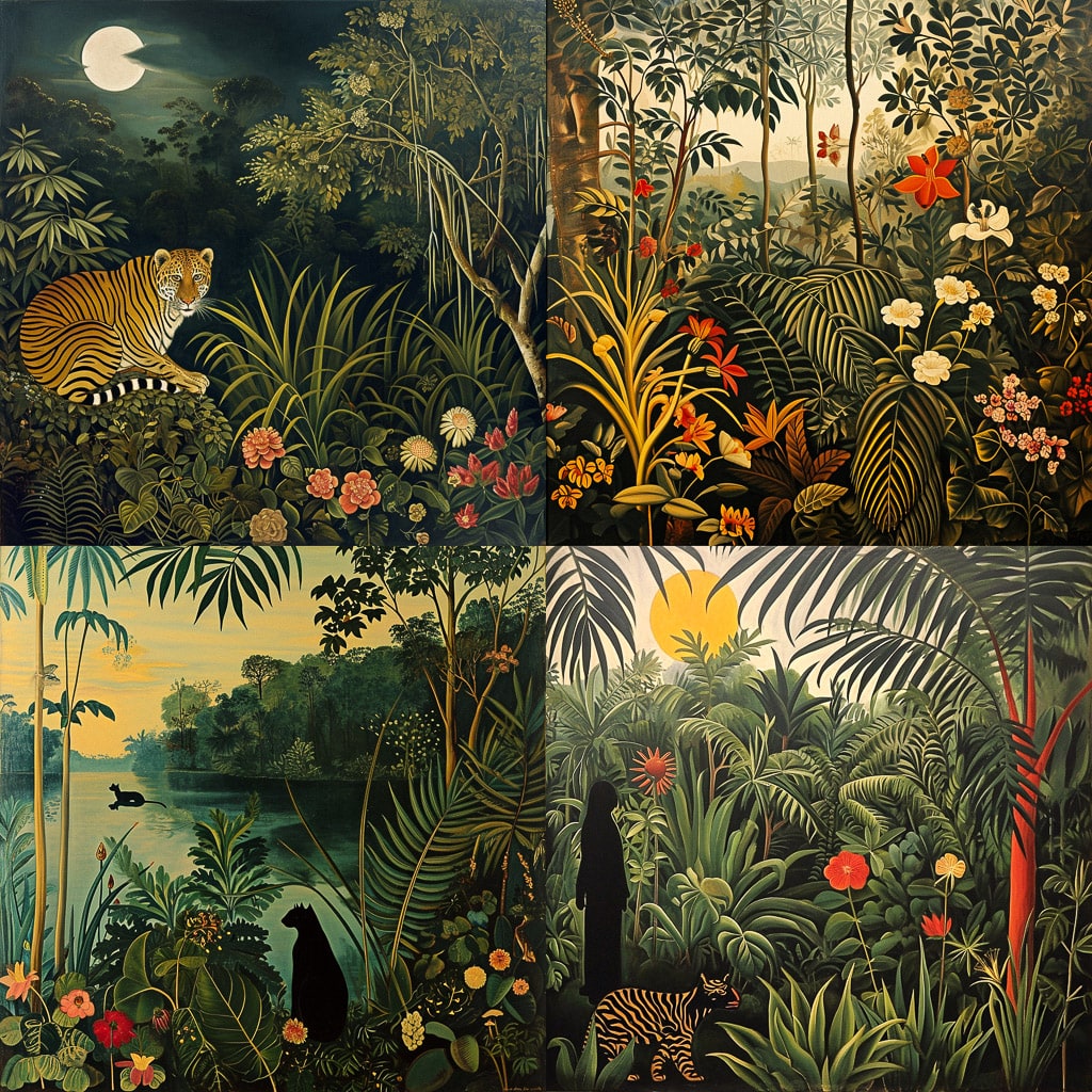 Руссо часто изображал экзотические пейзажи и сцены из жизни, которые казались ему удивительными и загадочными. Его работы отличаются вниманием к деталям и любовью к природе.