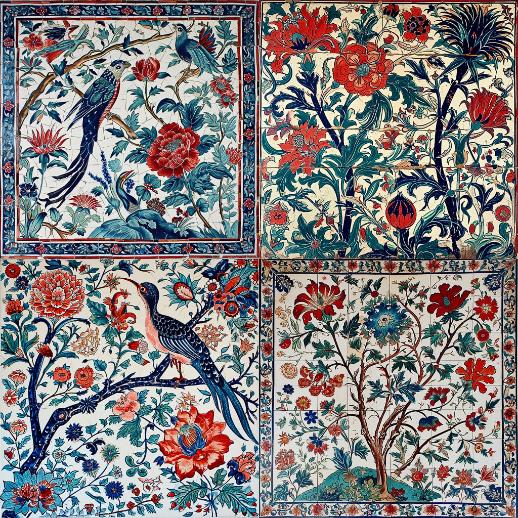 Iznik tiles относятся к османской керамике XVI–XVII веков. В этот период мастера создавали плитки с изображениями цветов, птиц, животных и растительных узоров. Для изготовления Iznik tiles используются высококачественные глины и натуральные пигменты, что обеспечивает долговечность и яркость цвета.