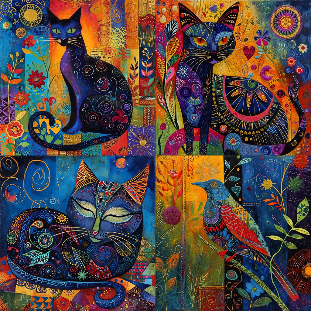 Laurel Burch — американская художница, известная своими яркими и красочными работами в стиле поп-арт и наивного искусства. Она использовала разнообразные техники, включая рисование, живопись и коллаж, чтобы создать уникальные и запоминающиеся произведения.