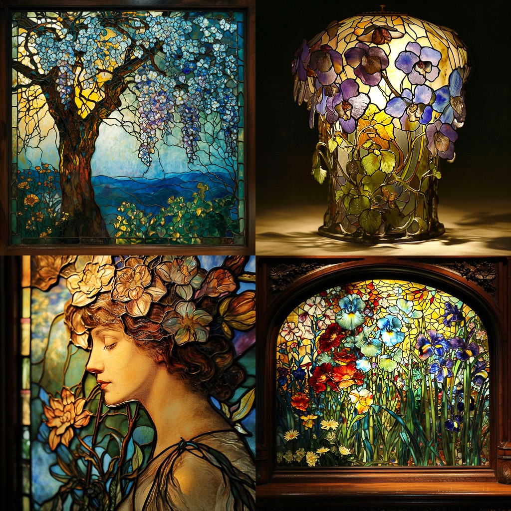 Тиффани известен своими уникальными витражами, которые отличаются яркими цветами и сложными узорами. Он использовал технику «фацетного стекла», при которой стекло гранится и полируется для достижения игры света и тени. Это придавало его витражам особую глубину и выразительность.
