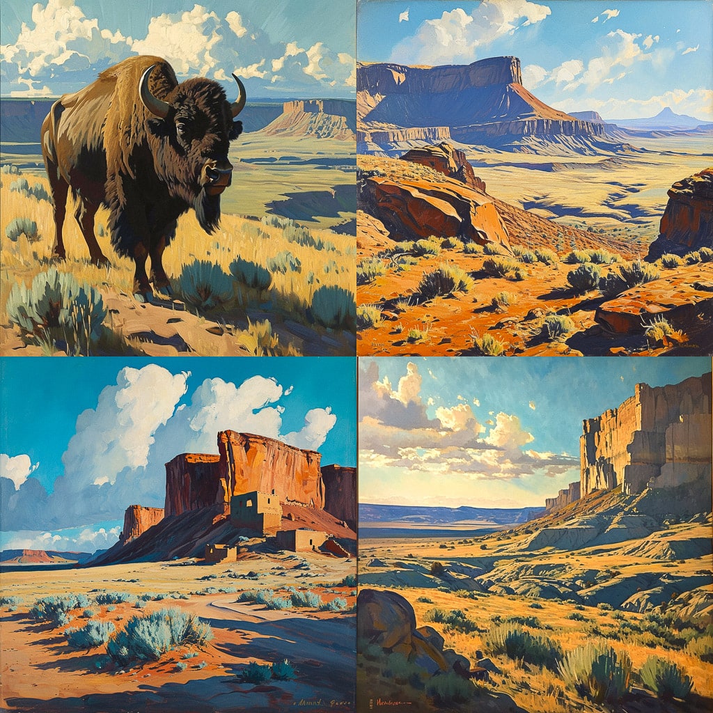 В своих пейзажах он изображал суровую красоту американского Запада, его бескрайние просторы и величие природы. Художник использовал насыщенные цвета и контрастные светотени, чтобы передать атмосферу и настроение места.