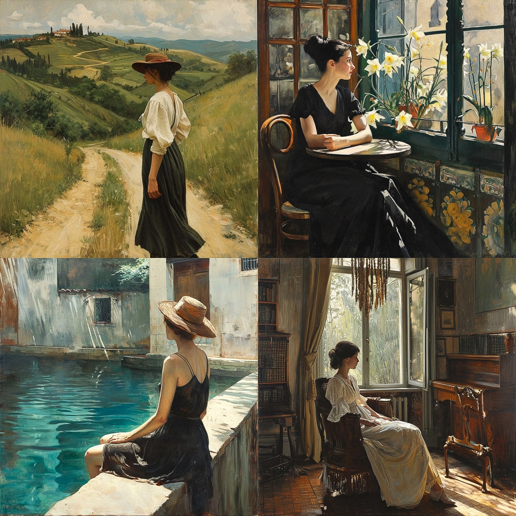 Его картины отличаются насыщенными цветами и динамичными композициями. Русинол умел создавать гармоничные сочетания оттенков, что придавало его полотнам особую глубину и атмосферу.