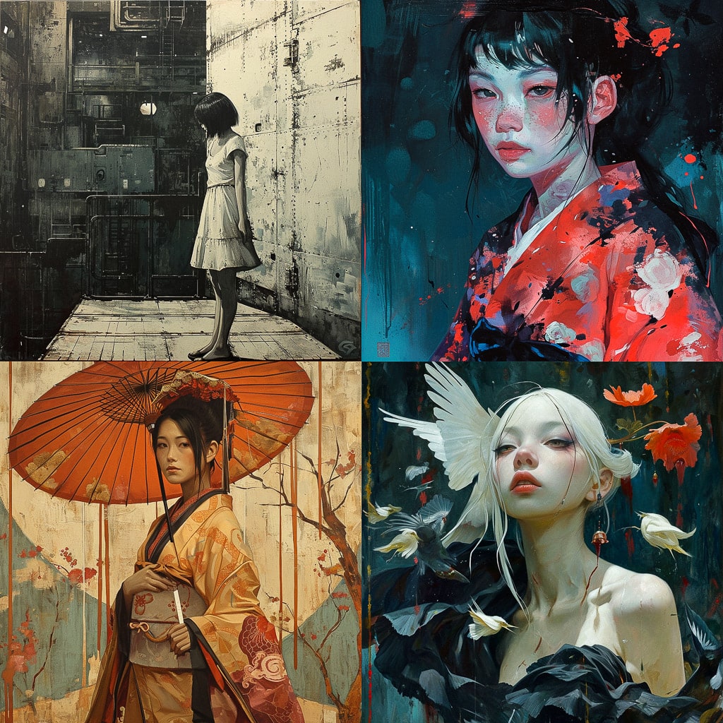 Художник использует разнообразные техники, включая живопись маслом и акварель, чтобы достичь максимальной выразительности своих работ. Его стиль сочетает в себе элементы традиционного японского искусства и современных западных тенденций, что делает его творчество уникальным и неповторимым.