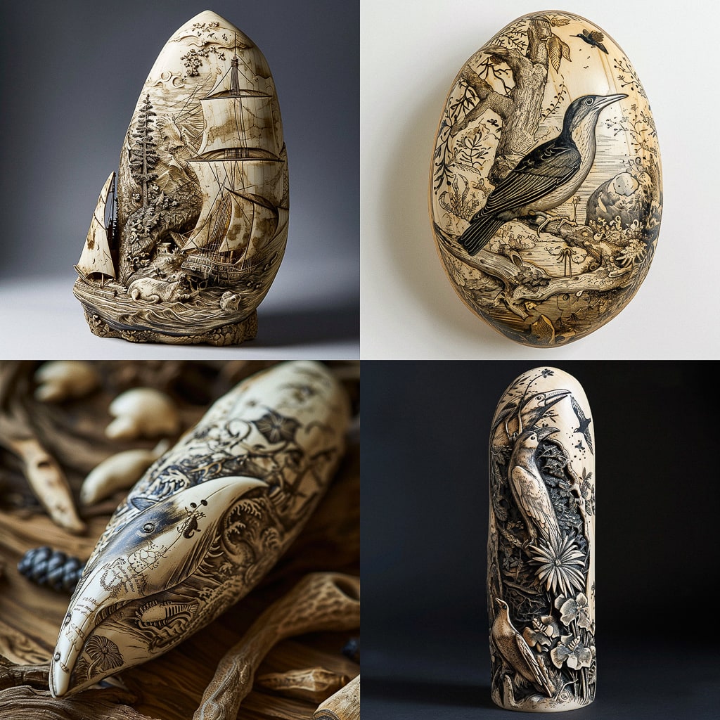 Scrimshaw сочетает в себе элементы гравировки и резьбы, позволяя создавать сложные и детализированные изображения. Тематика работ может быть разнообразной: от морских пейзажей и кораблей до абстрактных узоров и животных.