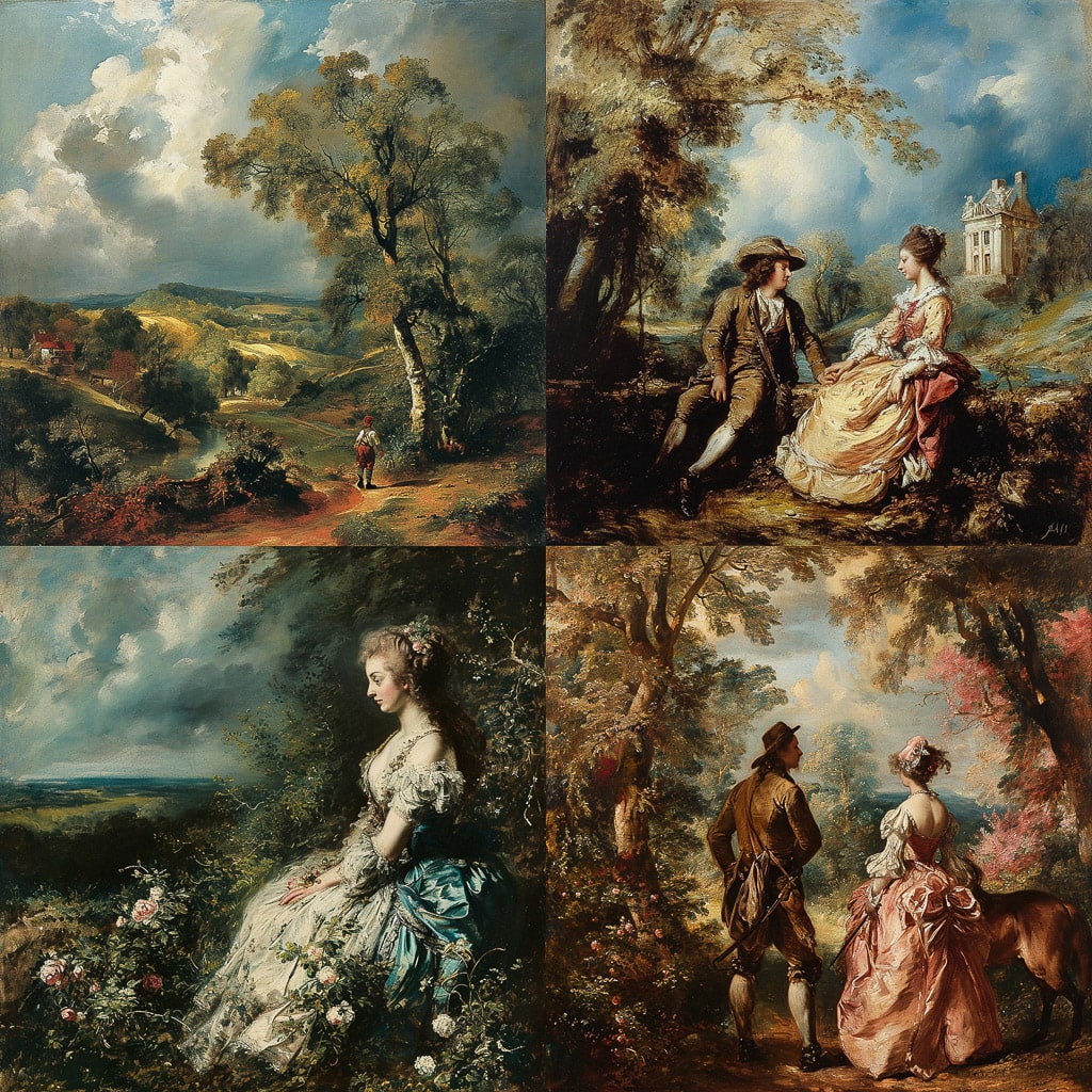 Гейнсборо известен своими портретами и пейзажами, в которых он мастерски передаёт игру света и тени, а также глубину эмоций и чувств. Его портреты отличаются естественностью и непринуждённостью поз, а пейзажи — живописностью и гармонией.