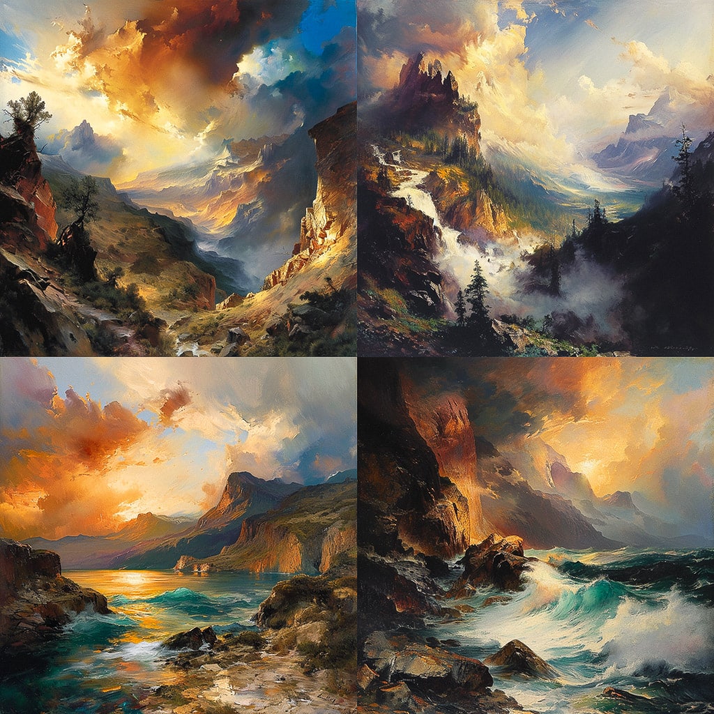 Томас Моран — американский художник-пейзажист, известный своими яркими и детализированными изображениями природы. Его работы отличаются насыщенными цветами и впечатляющими пейзажами, которые переносят зрителя в мир дикой природы. Моран был одним из основателей движения художников-пейзажистов, известного как «Школа реки Гудзон». Он уделял особое внимание игре света и тени, что придавало его картинам особую глубину и объём.