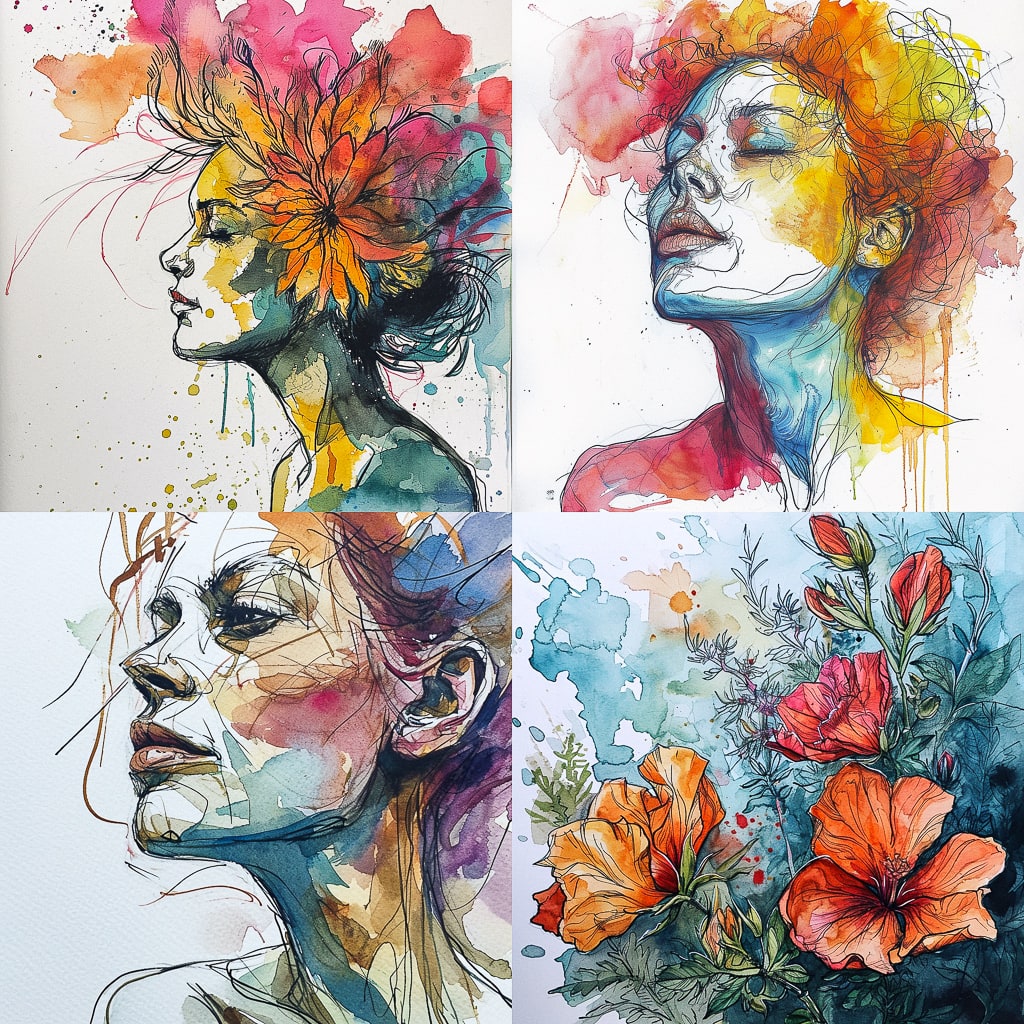 Watercolor with ink pen outline — это техника, которая сочетает акварель и контуры, выполненные чернилами. Акварель позволяет создавать мягкие, прозрачные слои цвета, в то время как чернила придают чёткость и выразительность линиям.