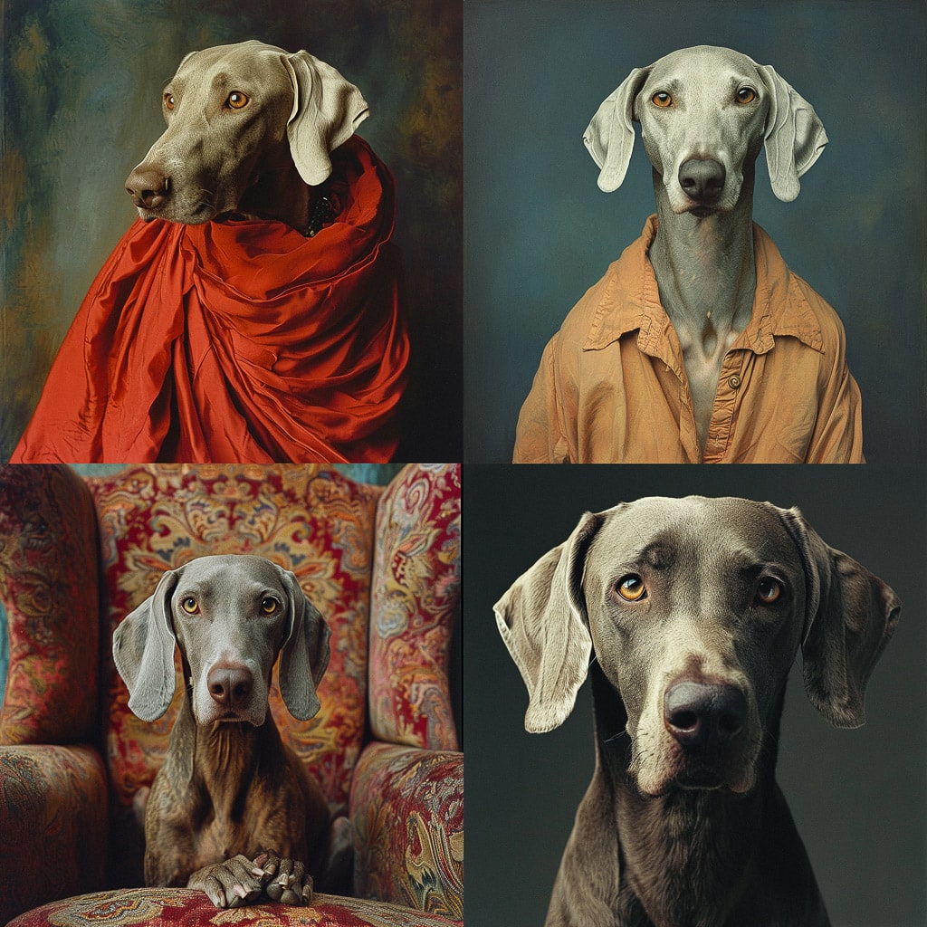 Уильям Вегман — известный американский художник, прославившийся своими фотографиями собак в комичных и трогательных образах. Его работы сочетают в себе элементы поп-арта и ироничного подхода к повседневности. Вегман использует игру с масштабами и неожиданными композициями, чтобы подчеркнуть человеческую природу животных. Его фотографии не только забавны, но и заставляют задуматься о взаимосвязи человека и природы. Стиль Вегмана узнаваем благодаря ярким цветам, выразительным лицам собак и юмористическому подтексту. Работы художника выставлялись в известных галереях и музеях, а также использовались в рекламных кампаниях. Творчество Уильяма Вегмана стало символом современного искусства, способного объединять людей через любовь к животным.