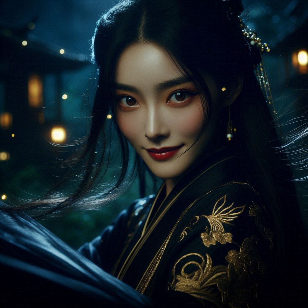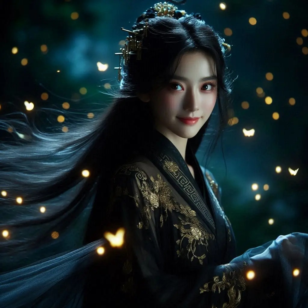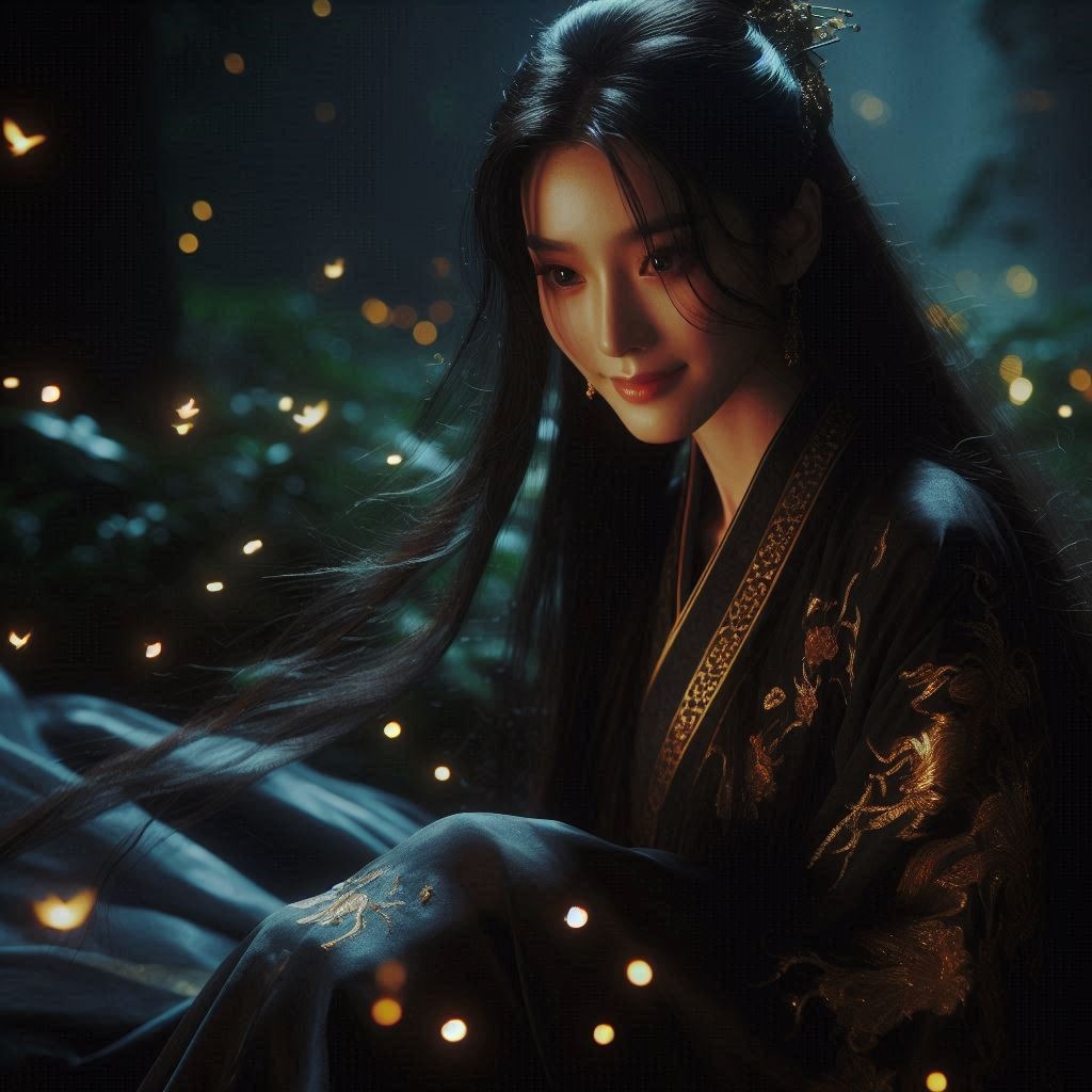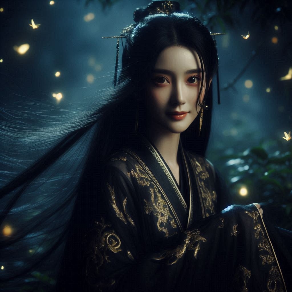 [Meiying] ([美颖]), an epic cinematic portrait, inspired by [Crouching Tiger, Hidden Dragon]. A [Chinese lady] emerges from the darkness of a [nighttime garden], her [black silk robe] shining with [golden embroidery]. [Fireflies] illuminate her [midnight black hair] as it flows gracefully down her back. [Serene expression], [deep-set eyes], [charming smile].