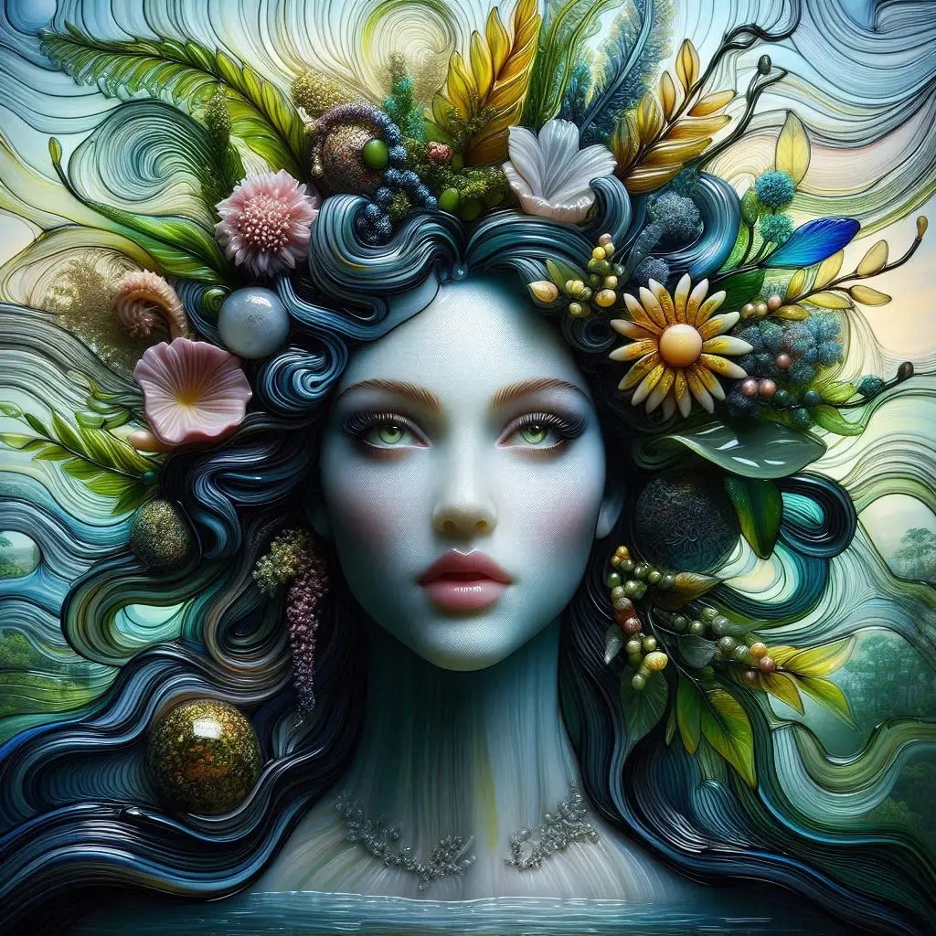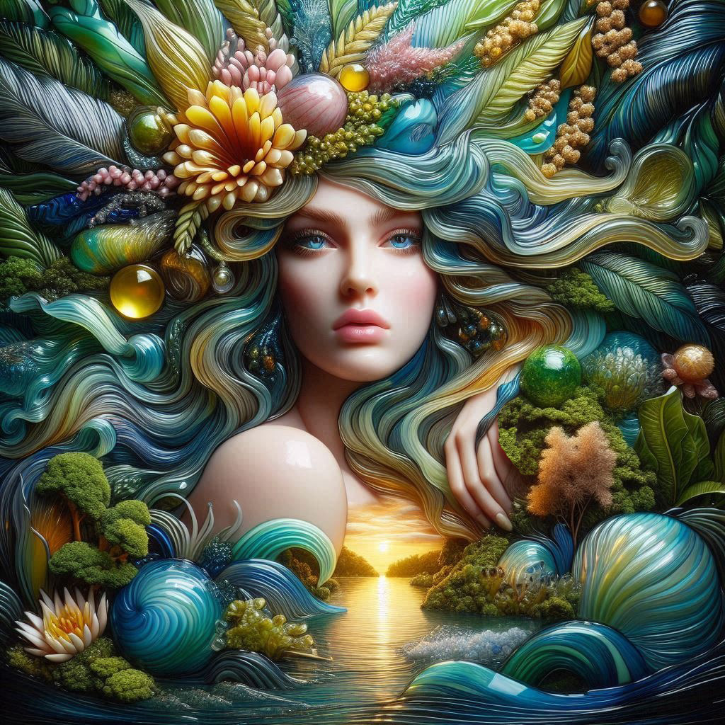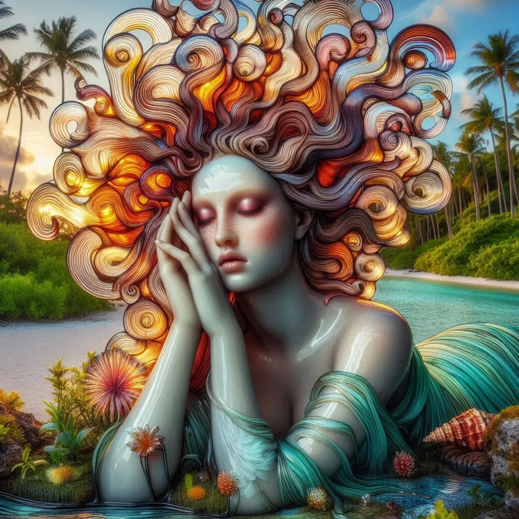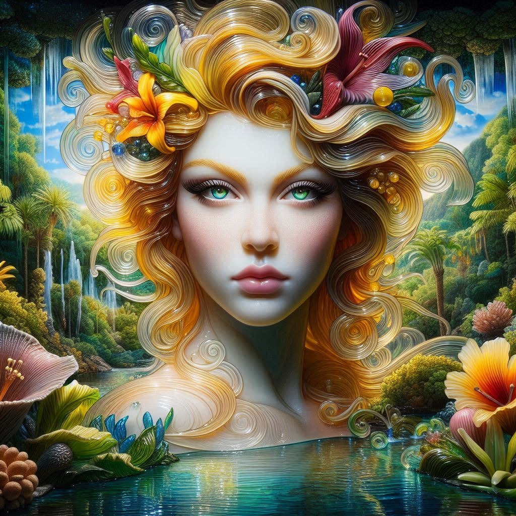 A fused glass masterpiece inspired by the fine details and luminous glazes of Jan van Eyck's oil paintings, combined with the grandeur of Elin Zimmerman's sculptures and water features. Amidst the lush beauty of paradise, a stunningly beautiful woman emerges, captivating a blend of the radiant glamour of Venus and the inspiring confidence of Lizzo, her detailed eyes and face reflecting the vibrant colors and natural splendor of the island, intertwining earthly grandeur.