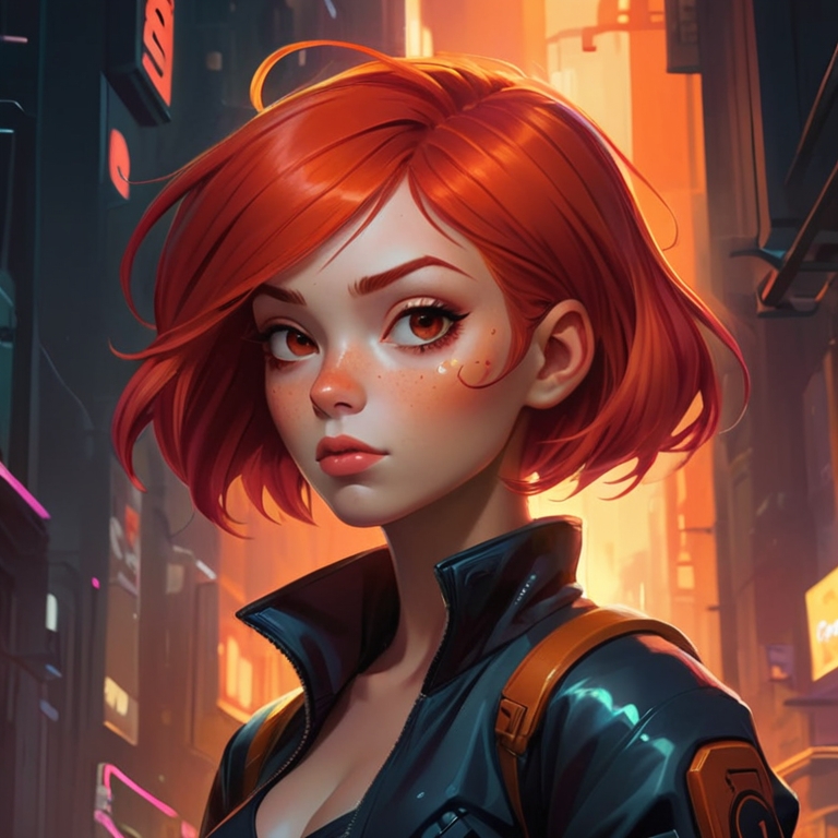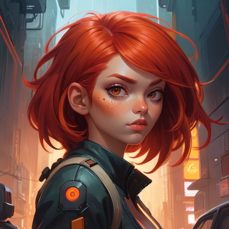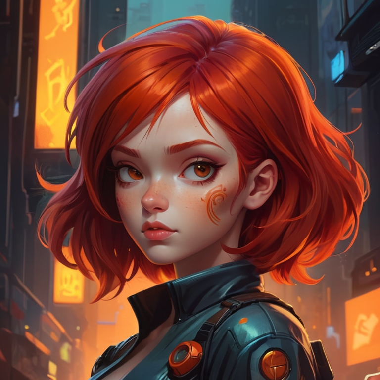 Погрузитесь в захватывающий мир киберпанка с цифровой живописью, изображающей девушку с рыжими волосами. Это изображение вдохновлено творчеством Лоис ван Барле, Сириля Роландо и Горо Фуджита, стилем Андреаса Роша, а также работами Beeple и Джеймса Джина.
