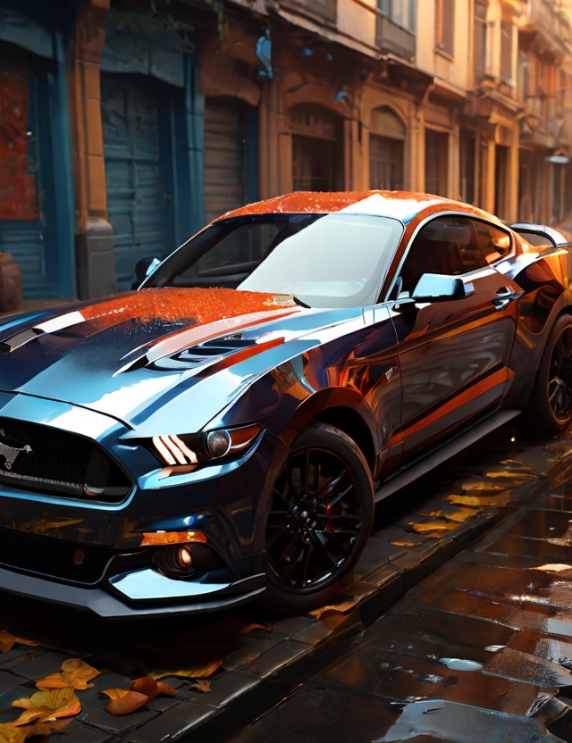 Объемное освещение проникает через композицию, усиливая драматический эффект сцены. Взаимодействие света и тени создает ощущение глубины и пространства, когда лучи света изящно танцуют по изгибам гладкого автомобиля. Богатые глубокие цвета вызывают чувство роскоши и притягательности, усиливая харизму Mustang
