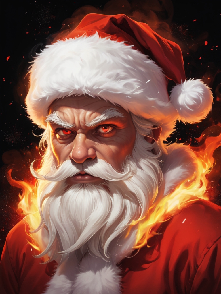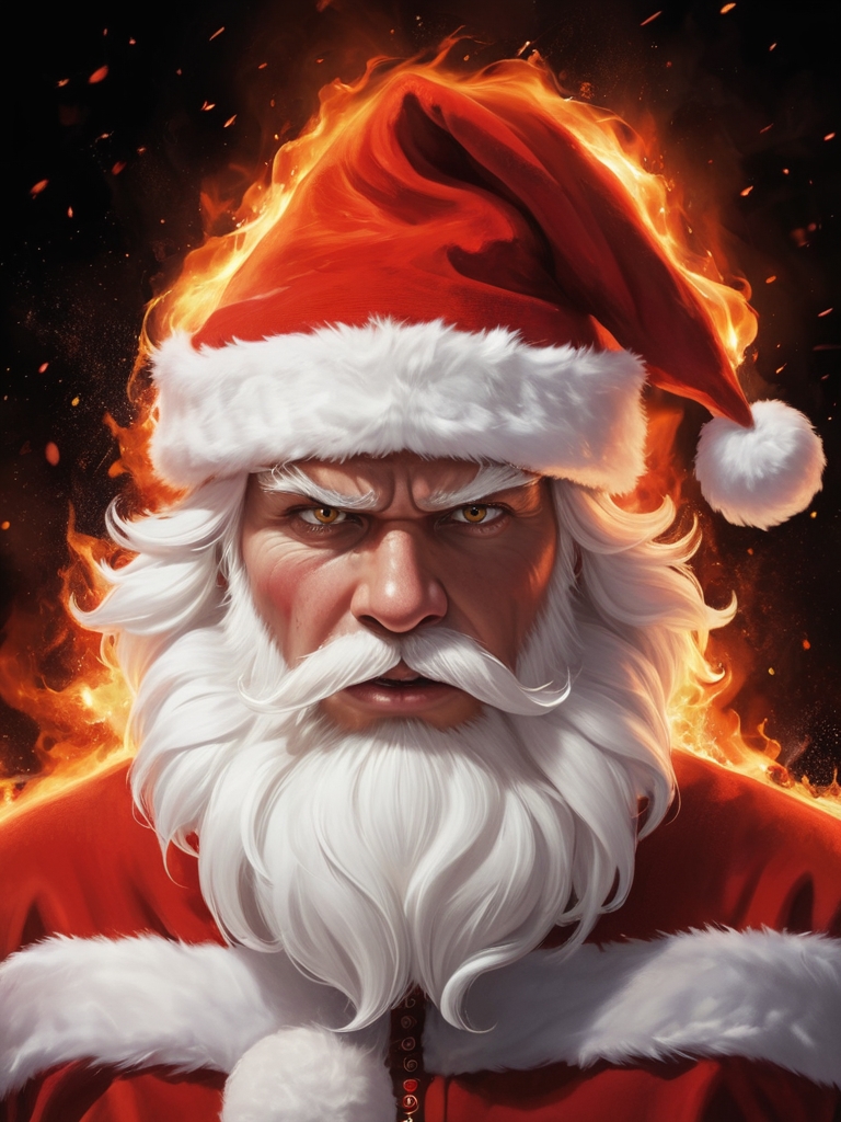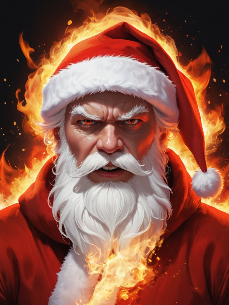 Цифровая иллюстрация лица Санта-Клауса. Его лицо окружено огненно-оранжевым и красным фоном.