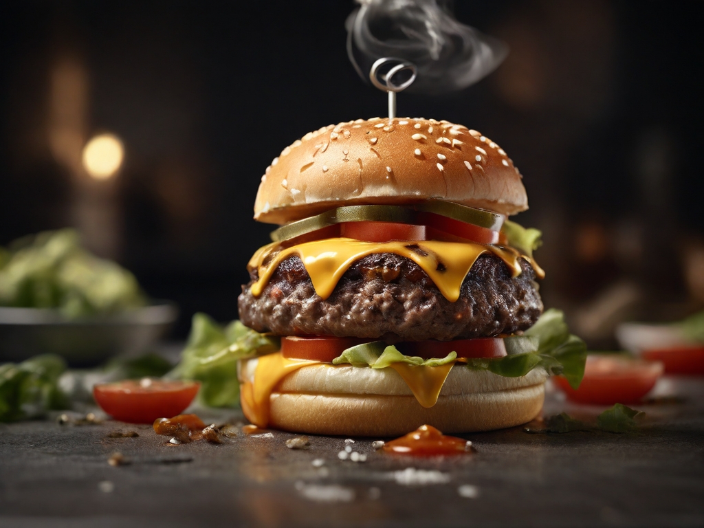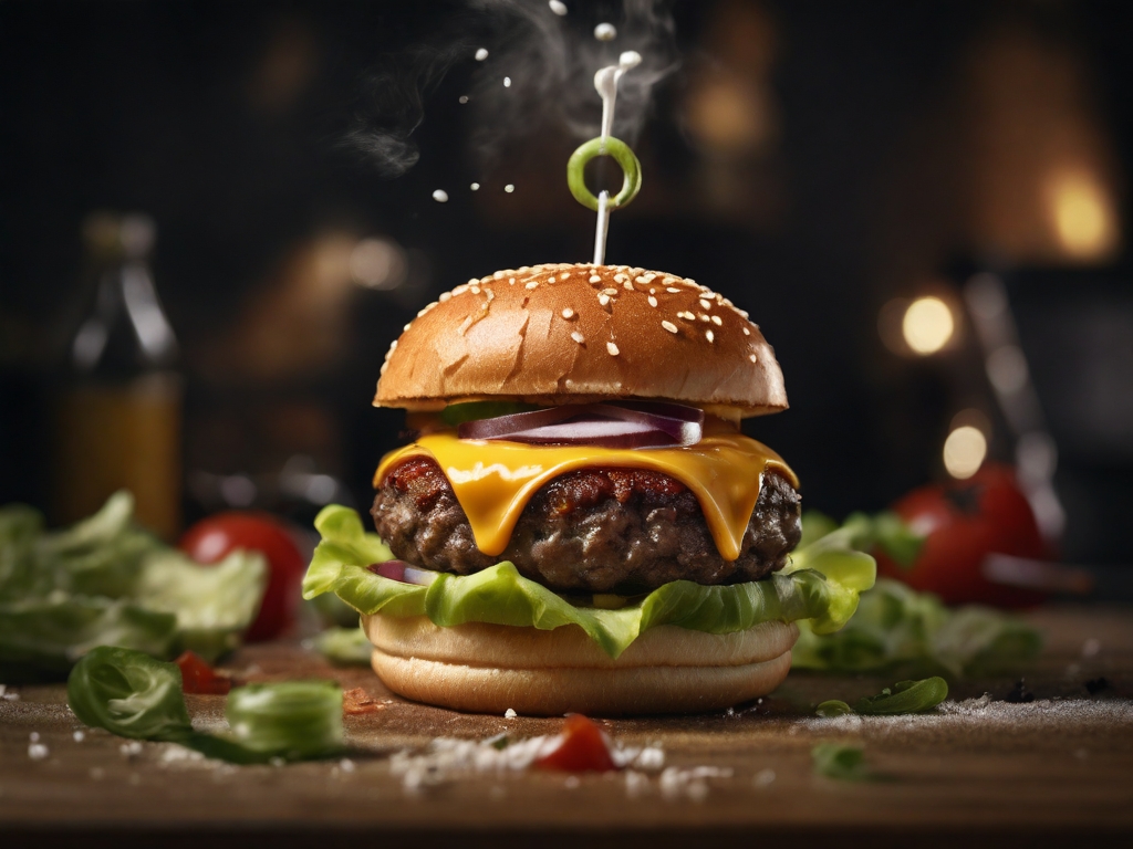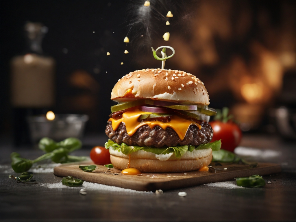 Фотография выполнена в стиле фотографии еды, чтобы передать аутентичный и аппетитный вид бургера. Каждый ингредиент, от сочной говяжьей котлеты до свежих овощей и сыра, отображается с высокой степенью детализации и реалистичности.