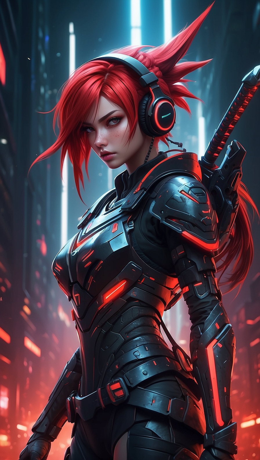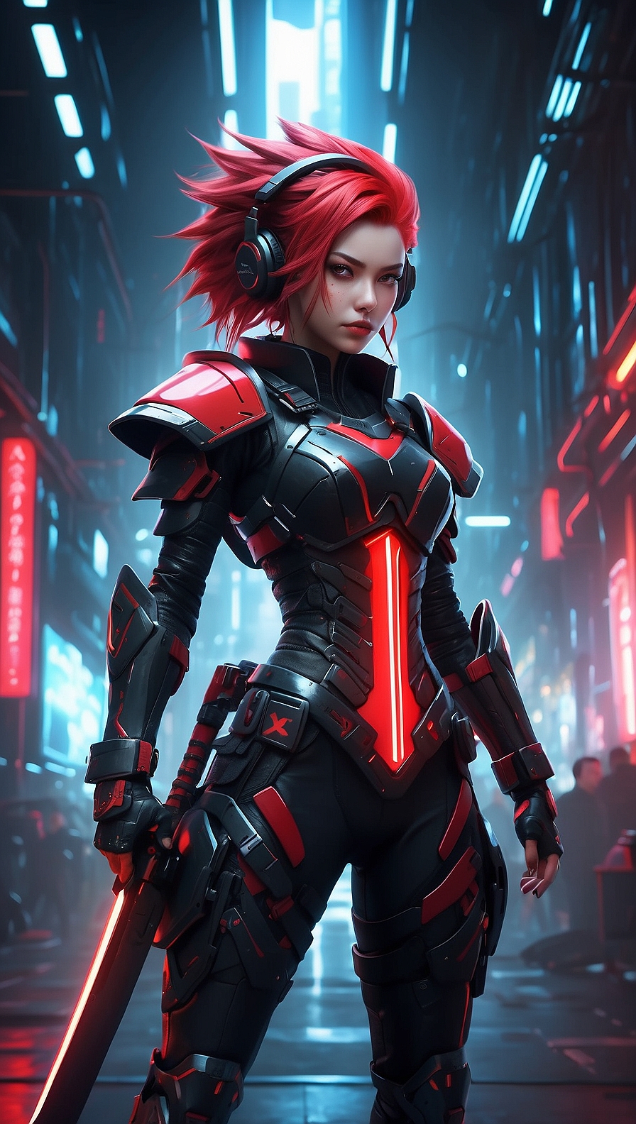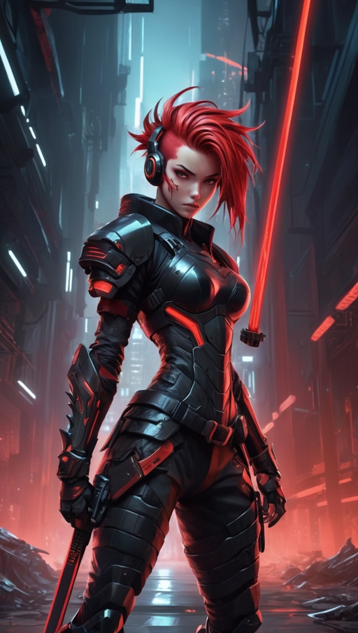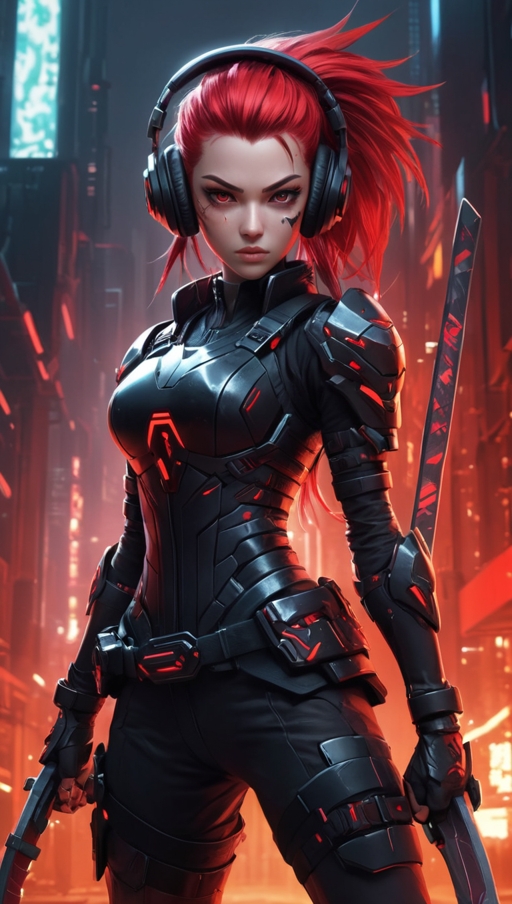 Аниме-стиль, динамичная боевая сцена: девушка с красными шипастыми волосами в чёрно-красной футуристической броне и наушниках держит светящуюся катану.
