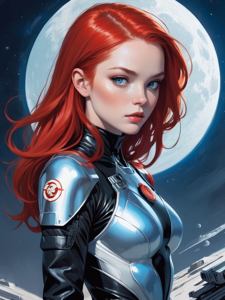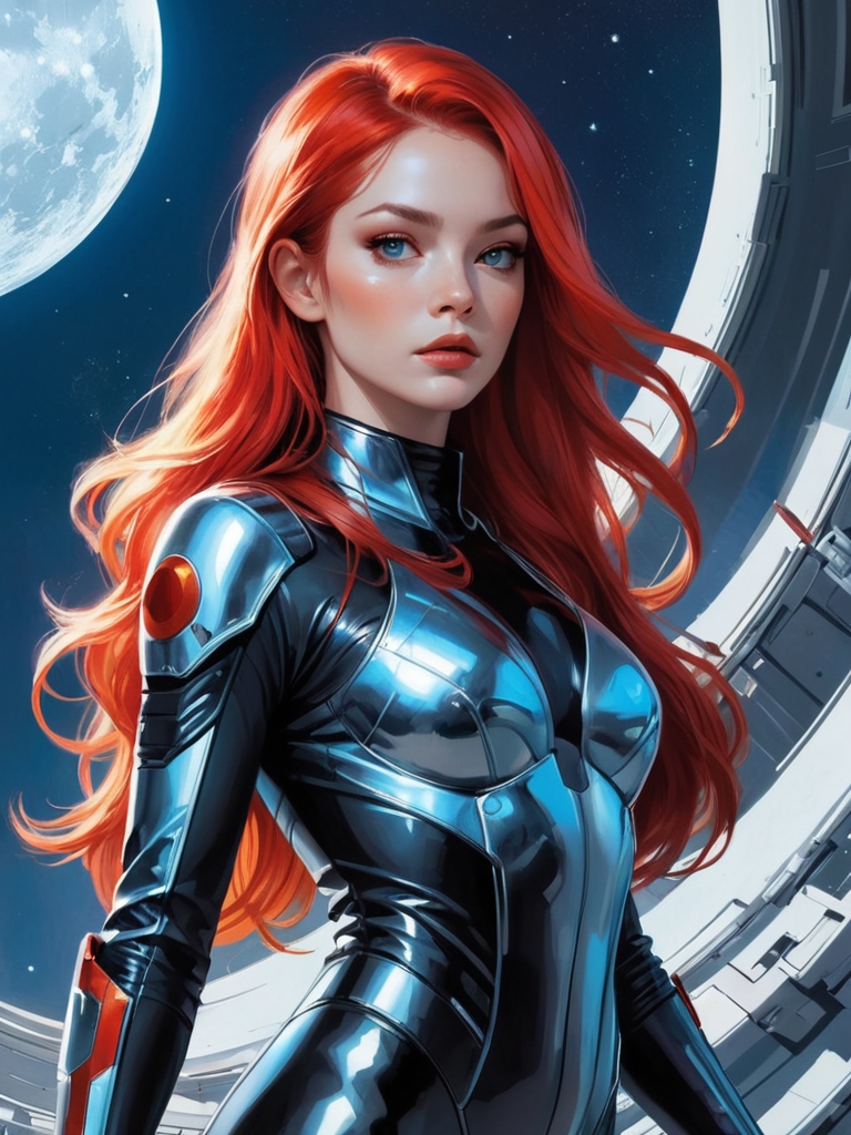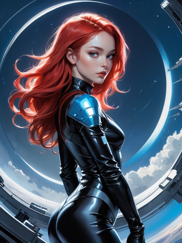 Девушка в футуристическом научно-фантастическом стиле, объединяющем элементы творчества таких художников, как Jim Lee, Russ Mills, Sakimichan и других. У нее длинные струящиеся красные волосы и обтягивающий черный костюм из блестящего материала, напоминающего кожу, с металлическими акцентами и ремнями.