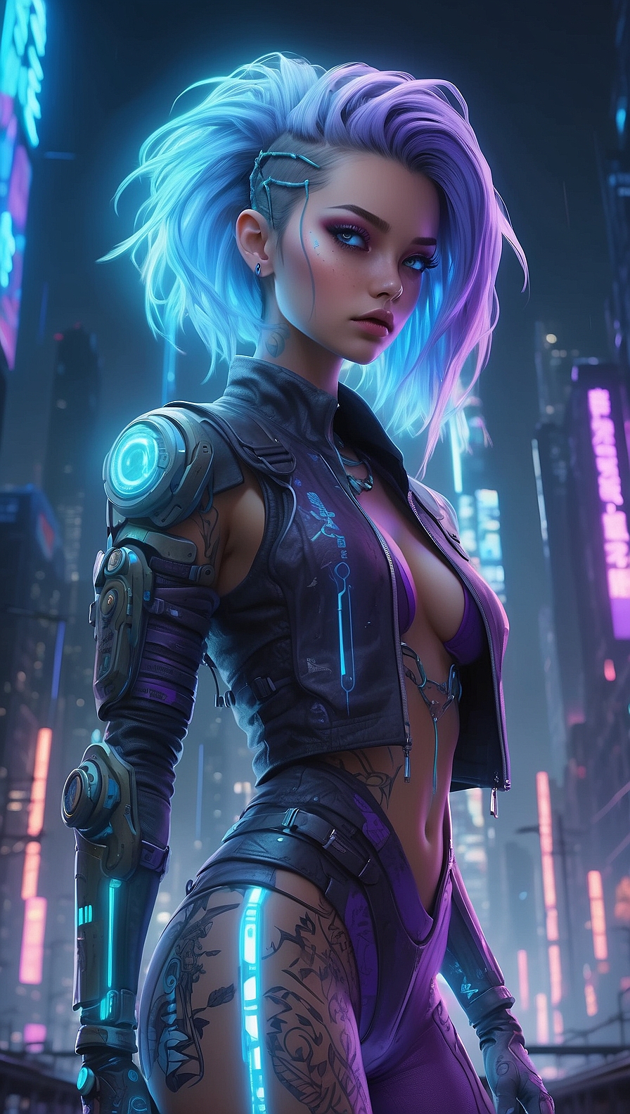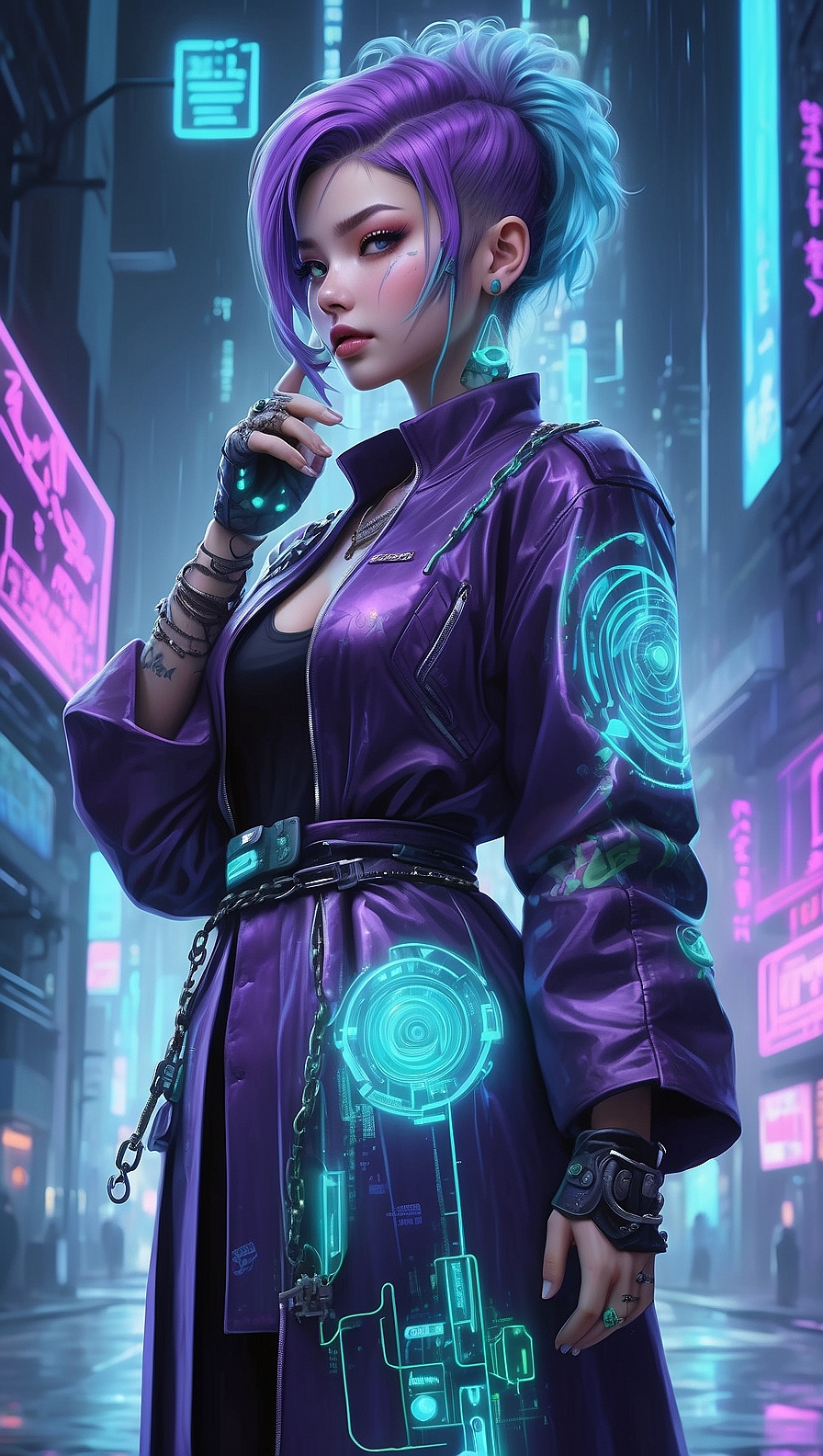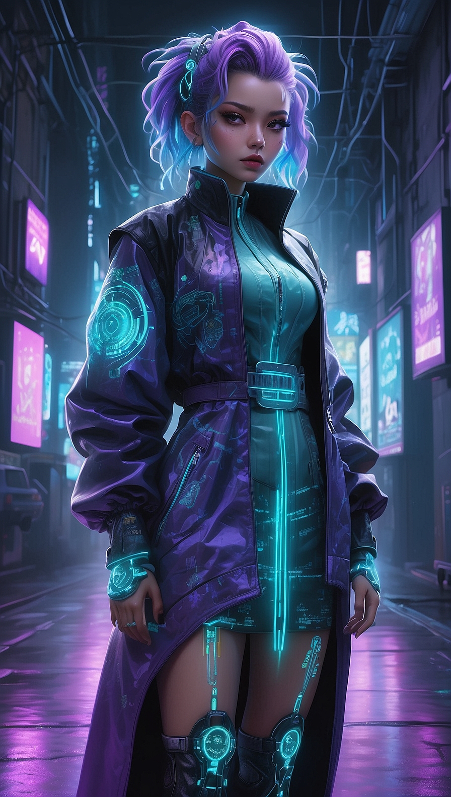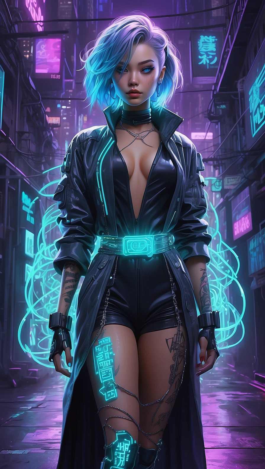 Кибер-жрица в неоново-синей одежде с цифровыми светящимися узорами, её аура — вихрь кодов и электро-разрядов