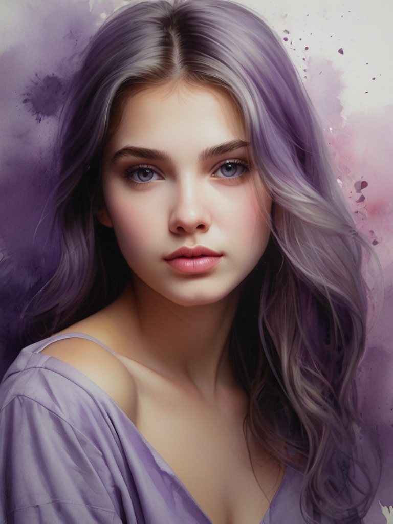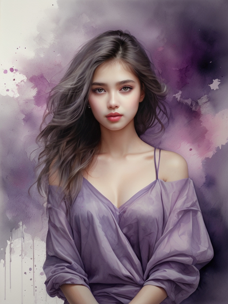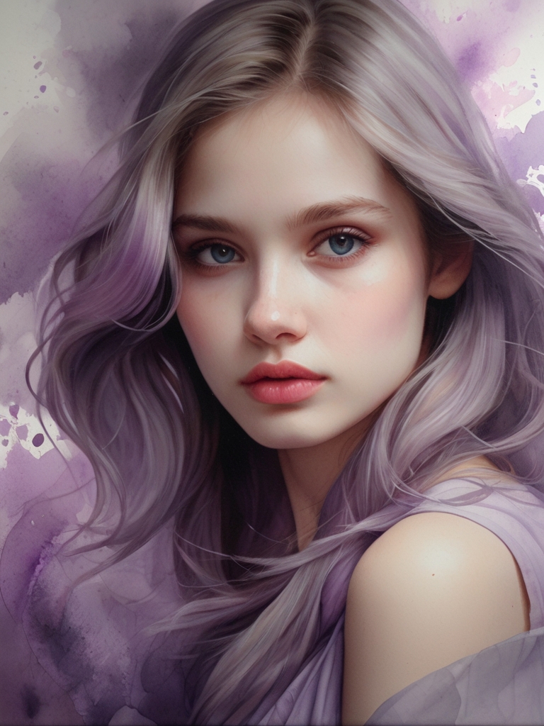 Посмотрите на завораживающий акварельный шедевр - видение девушки, купающейся в оттенках фиолетового, розового и серого. Ее светлый цвет лица элегантно изображен с изящным дизайном, аккуратно вписываясь в размеры холста. Этот цифровой рендер - свидетельство мастерства художника, использующего золотое сечение и сверхтонкие мазки для создания высокодетализированного произведения искусства. Лицо девушки находится в центре внимания, притягивая зрителя взглядом, который, кажется, пронзает холст насквозь, обращенный вперед и в центр.