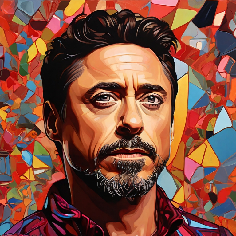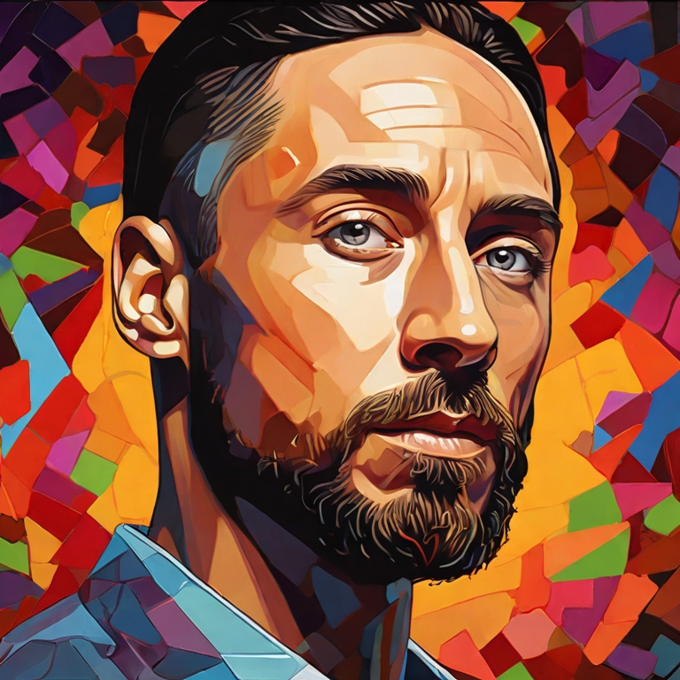 Картина выполнена в стиле синтетического кубизма и представляет собой высокодетализированный фотопортрет, созданный с использованием Adobe Illustrator и векторной графики. Это произведение искусства является ярким и сложным, с проработанными деталями, которые привлекают внимание зрителя.
