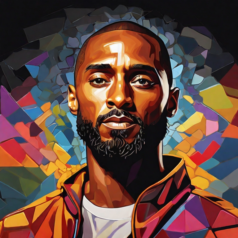 Этот промт предлагает портрет мужчины с бородой в векторном стиле, вдохновленной Чаком Клоузом. В ней также присутствуют элементы, вдохновленные работами Окуда Сам Мигеля. Портрет изображает Кобе Брайанта и Алана Уоттса, с детальным передним планом, который создает гипнотический эффект. Картина выполнена в стиле синтетического кубизма с использованием Adobe Illustrator и векторной графики. Она является высокодетализированным фотопортретом, привлекающим внимание своими яркими и сложными деталями.