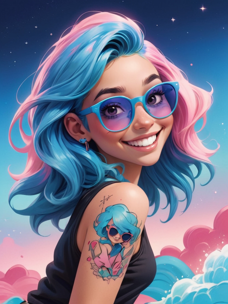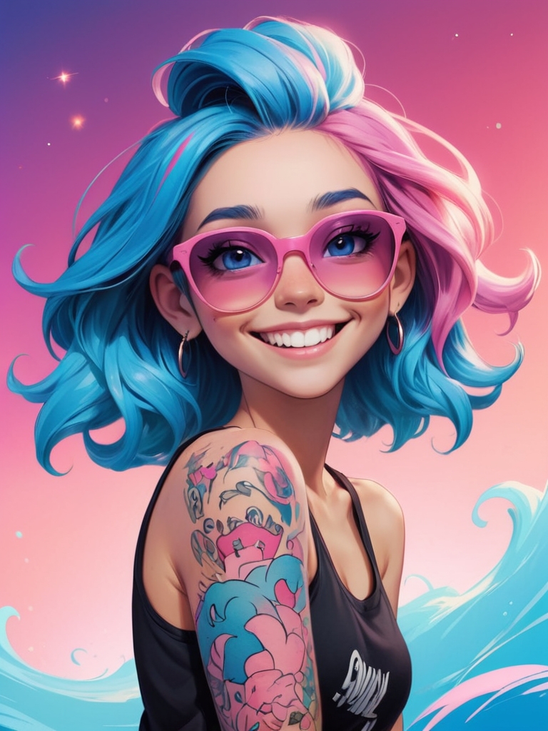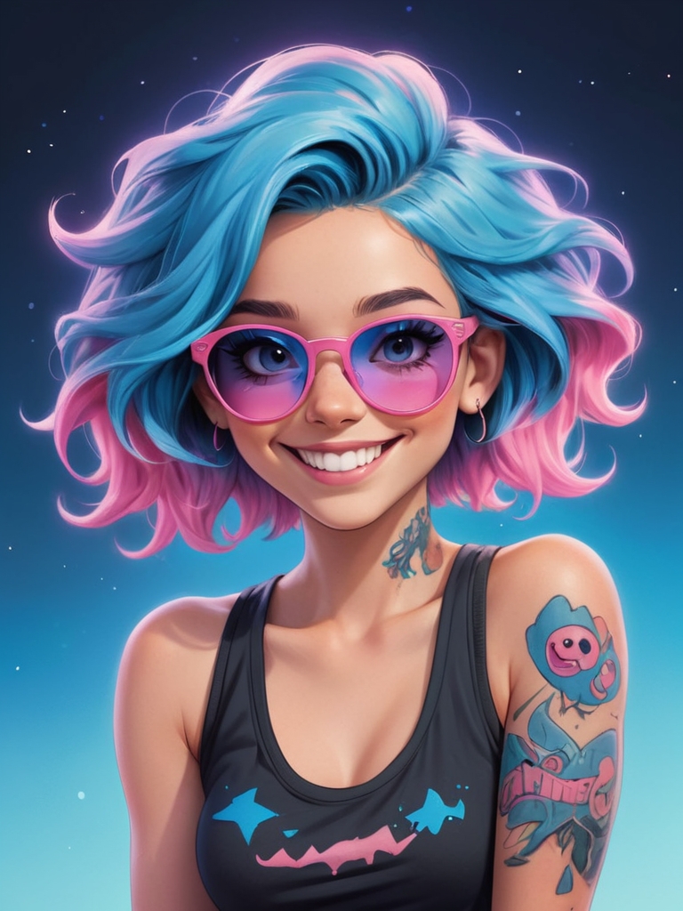 Цифровая иллюстрация девушки в аниме стиле с голубыми волосами и розовыми солнечными очками.
