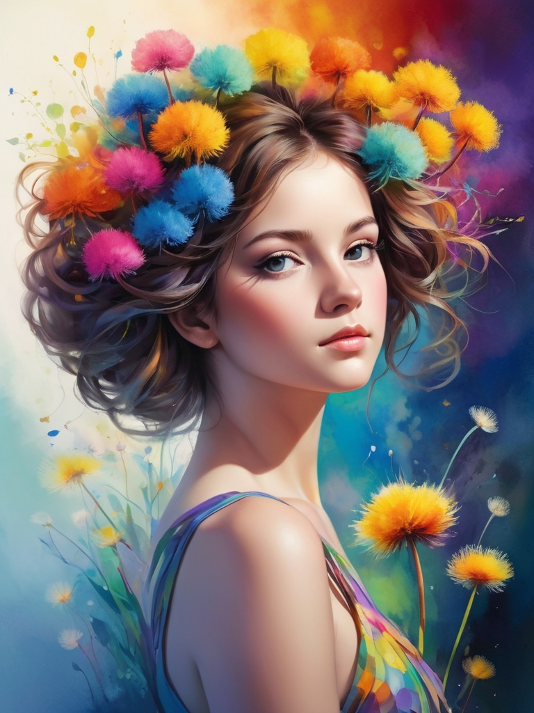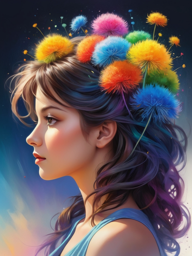 Давайте погрузимся в сюрреалистический мир, захватывающей цифровой живописи, которая передает сущность мечтательной теплоты и крайних эмоций. В этом мастерском крупном плане появляется силуэт девушки, нарисованный в завораживающем многоцветном черниле, с пушистыми одуванчиками всех цветов радуги, тщательно вплетенными в ее волосы. Естественные линии и изгибы формы девушки приобретают скульптурное качество, размывая границы между реальностью и воображением.