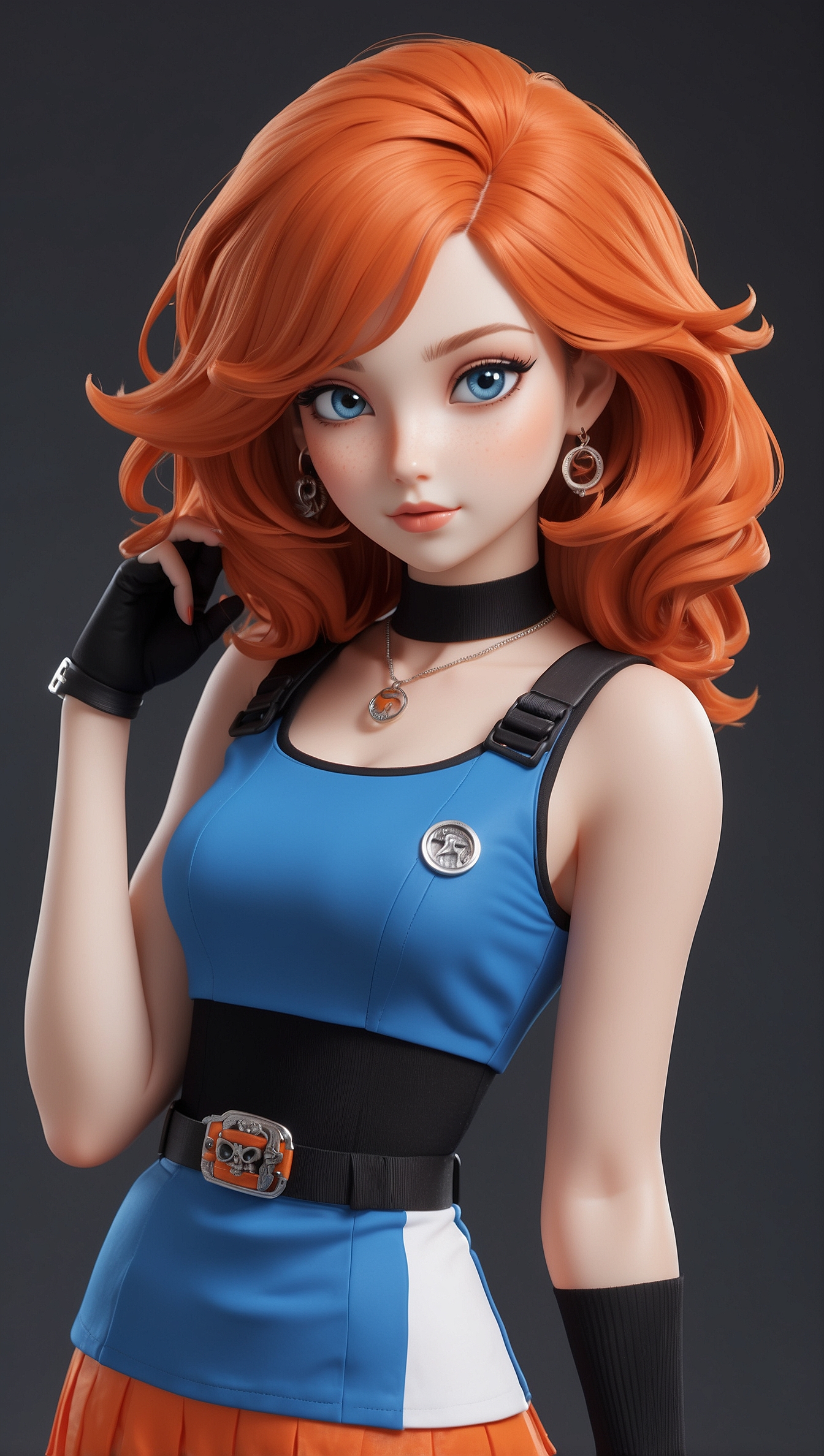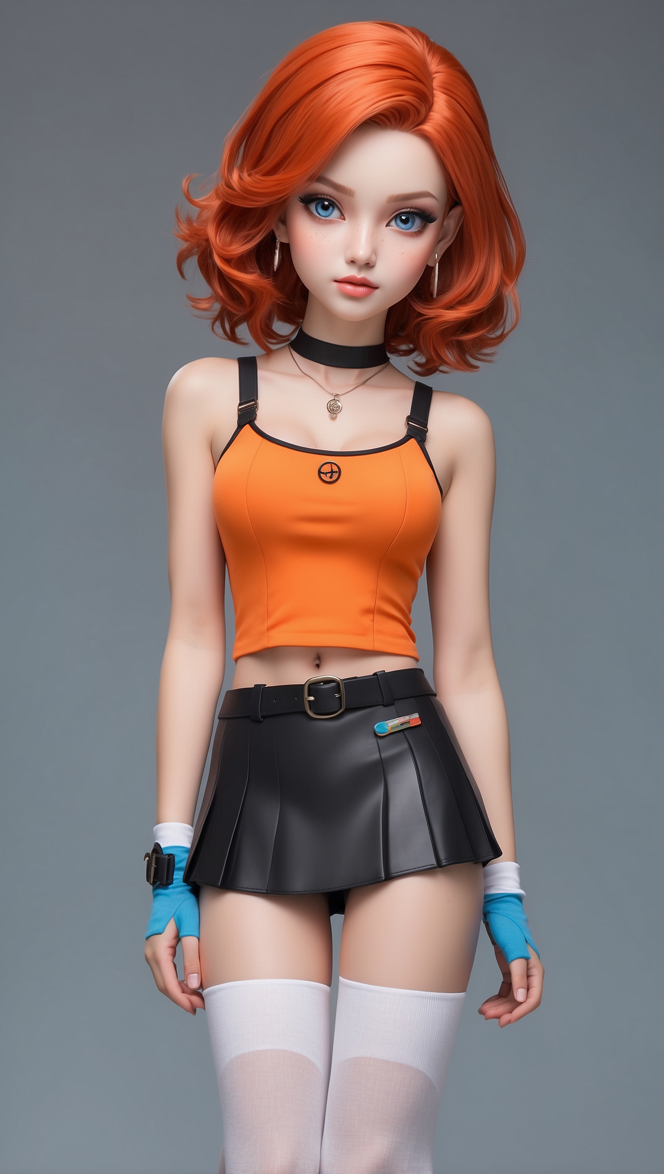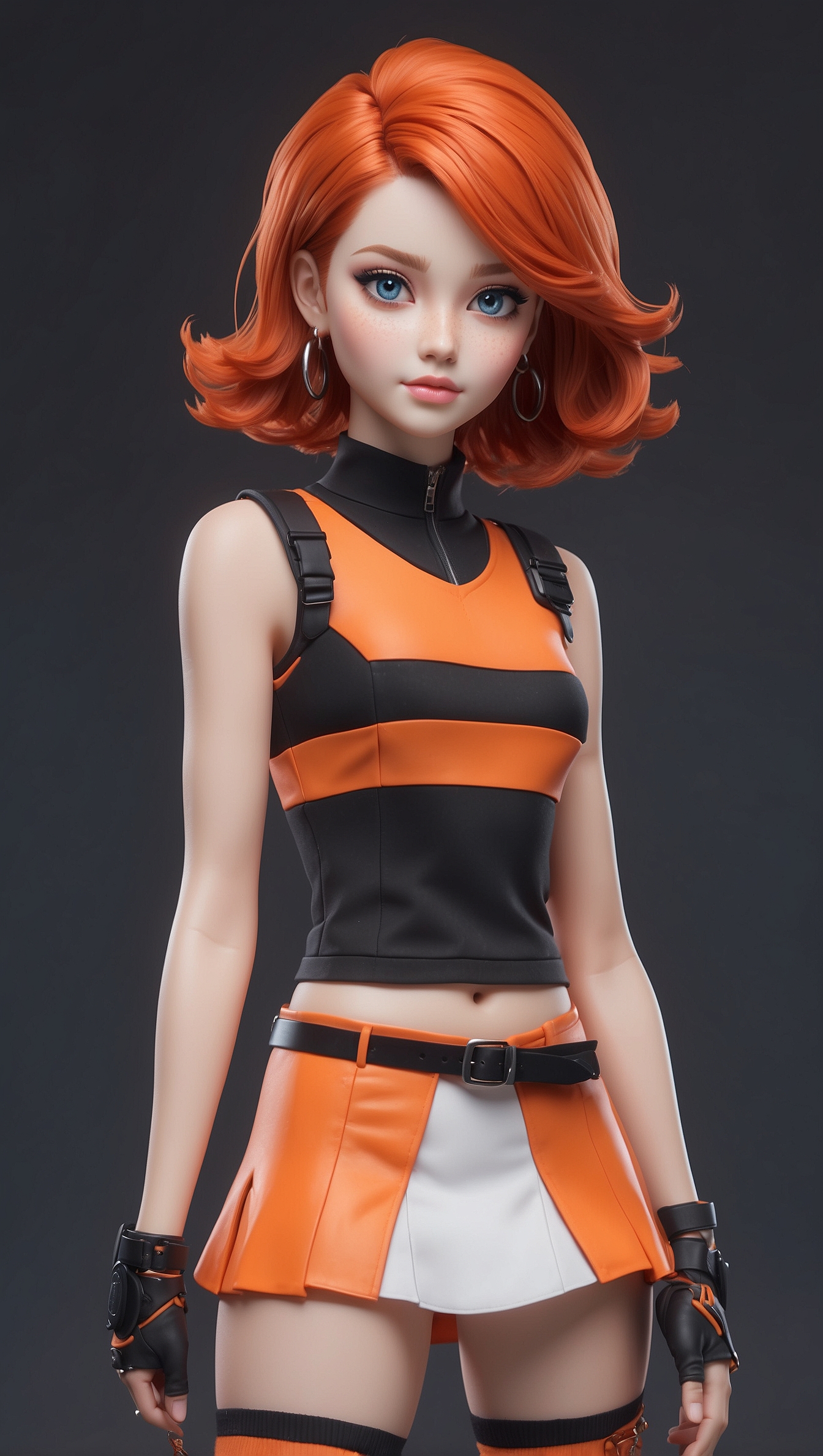 Девушка с ярко-рыжими волосами до плеч и ярко-голубыми глазами. На ней оранжевый топ, коротка плиссированная юбка и длинные белые гетры.