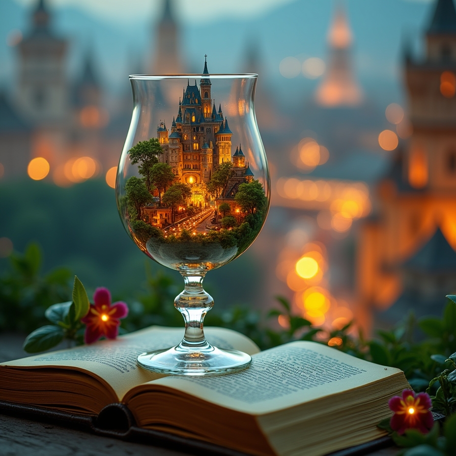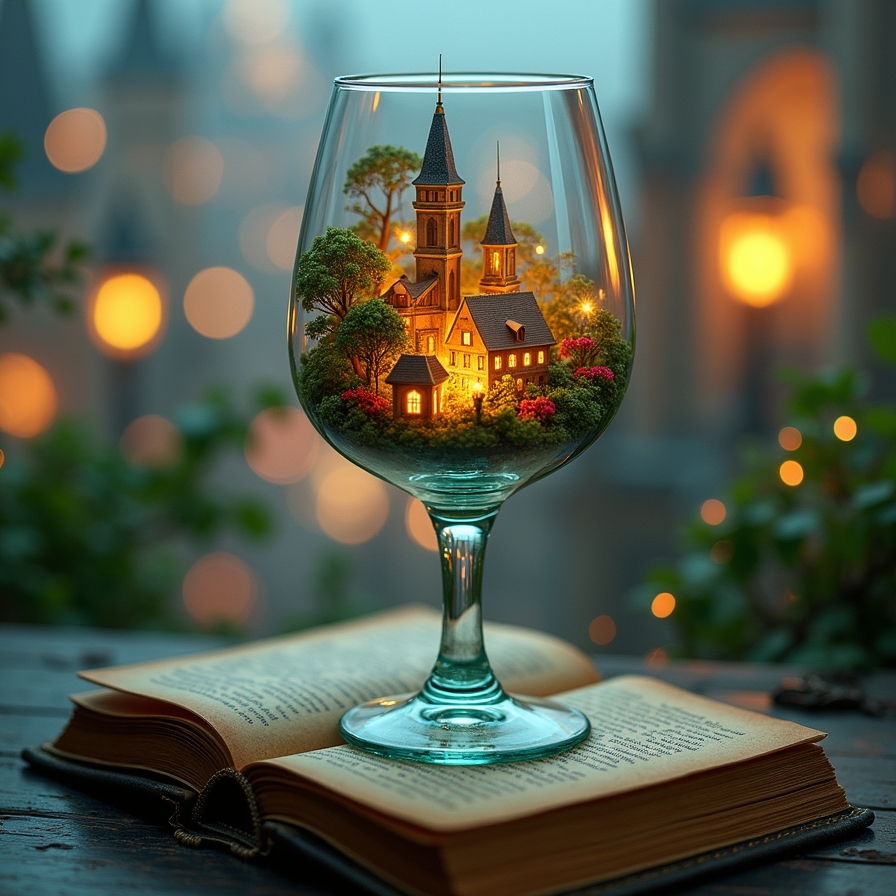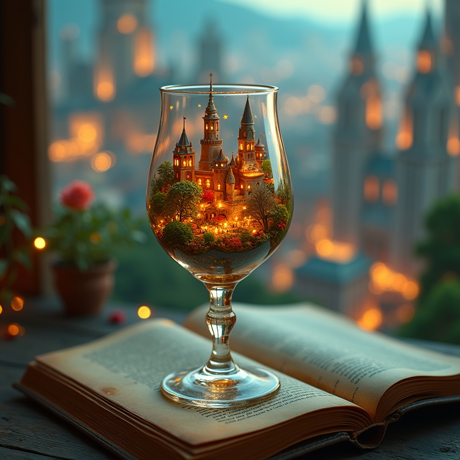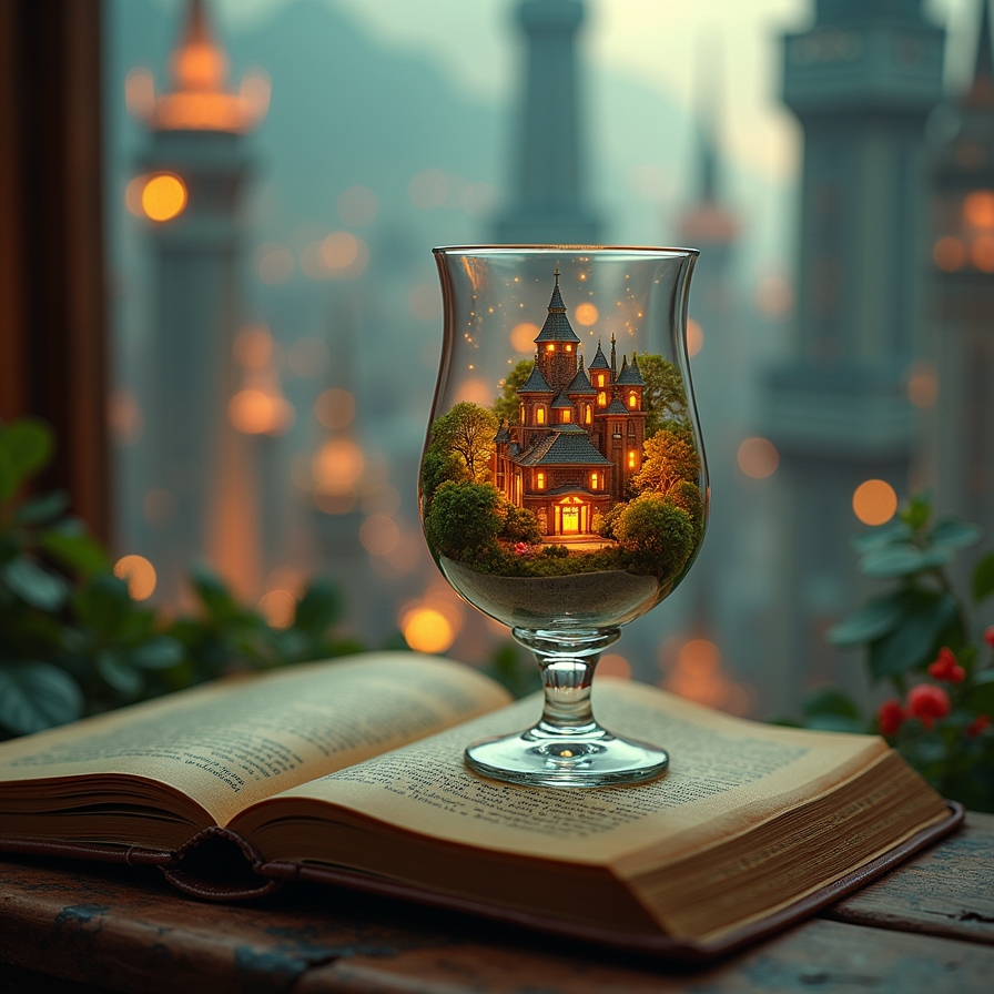 В стеклянном бокале возникает миниатюрный город, освещенный мягким золотистым светом. Бокал стоит на раскрытой книге, словно ждет своего часа, чтобы рассказать волшебную историю. Детали окружающей обстановки усиливают магическую ауру. На заднем плане городской пейзаж растворяется в мягких тонах, создавая ощущение сказочности.