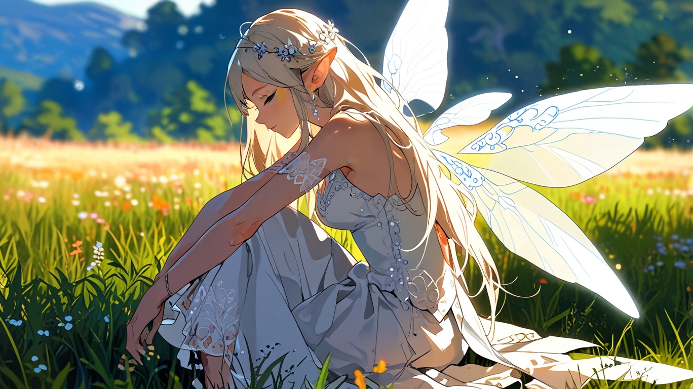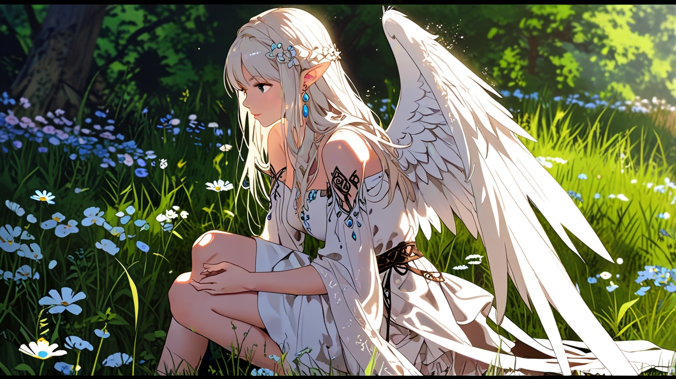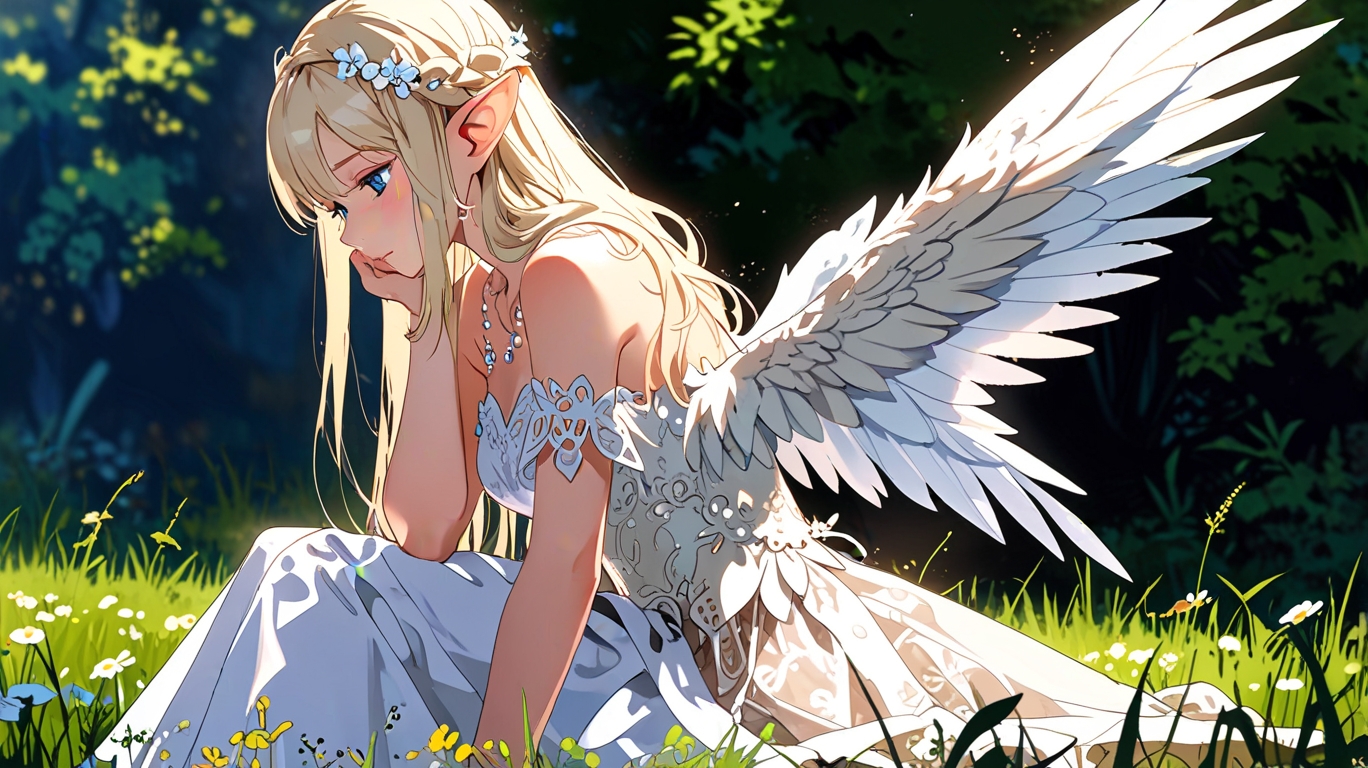 Эльфийка сидит на цветочной поляне. Вокруг тишина и спокойствие, но она этого не ощущает. Что у нее на уме? Что её гнетёт? Только ей это известно. Но рядом нет никого, с кем можно было бы поделиться тревогами.